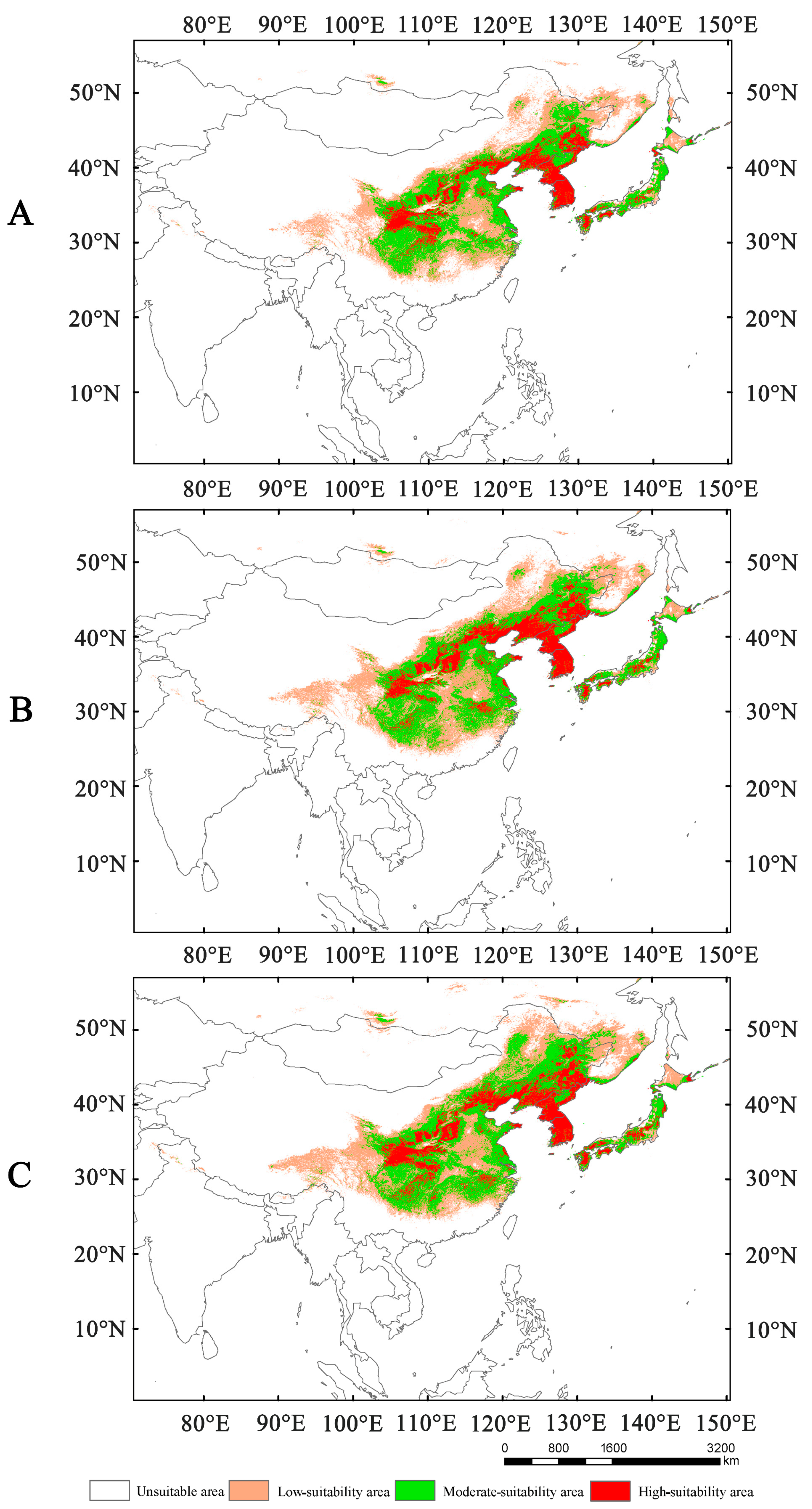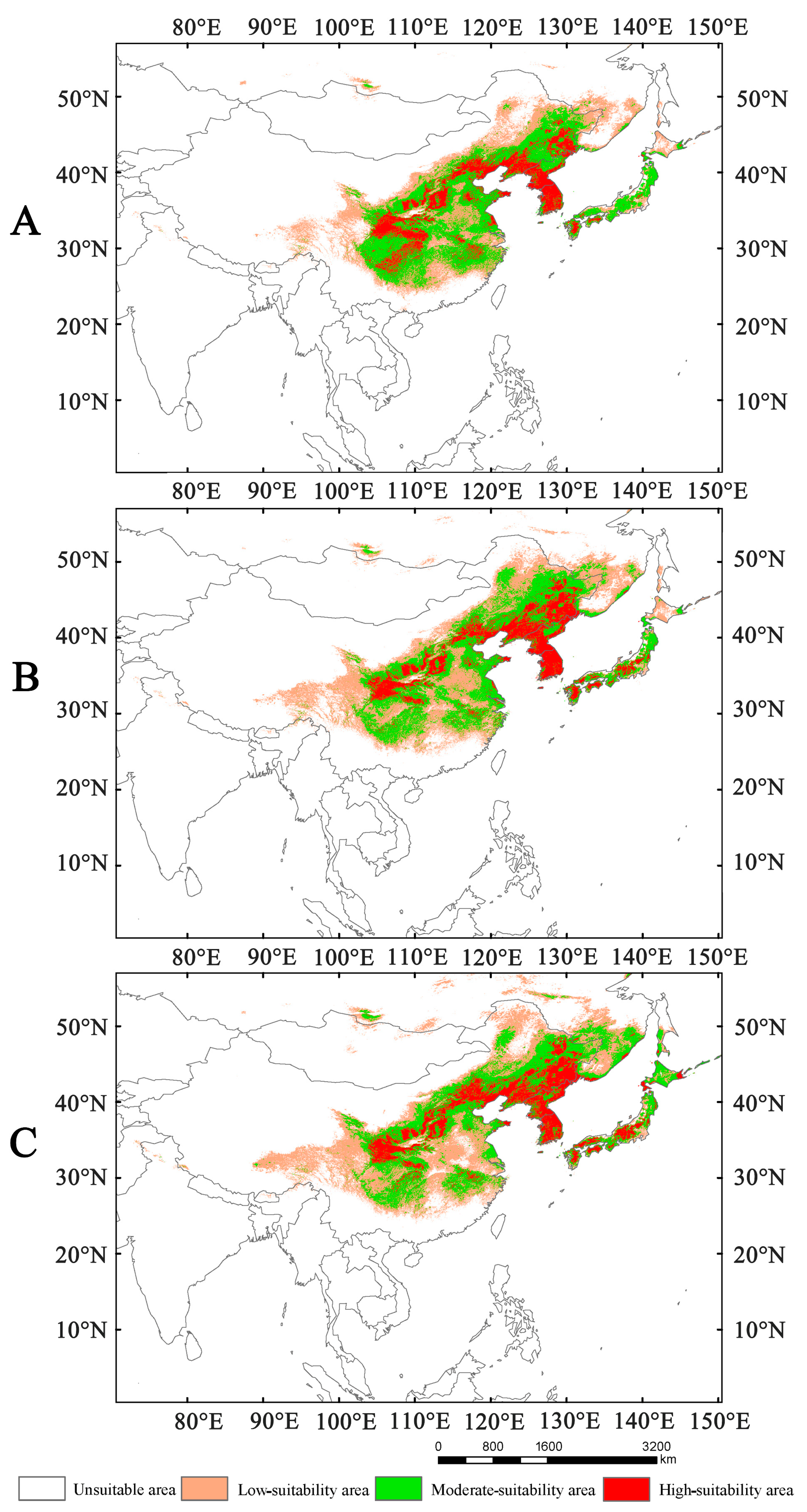 - Wang, J.Q.; Wang, S.Y.; Li, Y.C.; Ding, S.M.; Wei, Z.H.; Shi, A.M.; Yang, D. Distribution pattern and change prediction of Luprops orientalis (Coleoptera: Tenebrionidae) suitable area in East Asia under climate change. Insects 2025, 16, 626. [Google Scholar] [CrossRef]