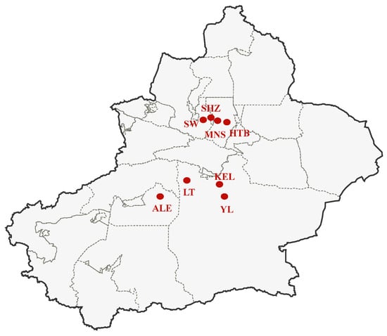 Map of sampling sites of Frankliniella intonsa from cotton fields in Xinjiang. ALE: Alaer, Aksu; KEL: Korla, Bayingolin; YL: Yuli, Bayingolin; LT: Luntai, Bayingolin; SW: Shawn, Tacheng; HTB: Hutubi, Changji; MNS: Manasi, Changji; SHZ: Shihezi, Shihezi.