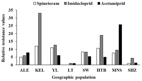 The relative resistance of different Frankliniella intonsa geographic populations to three insecticides. ALE: Alaer, Aksu; KEL: Korla, Bayingolin; YL: Yuli, Bayingolin; LT: Luntai, Bayingolin; SW: Shawn, Tacheng; HTB: Hutubi, Changji; MNS: Manasi, Changji; SHZ: Shihezi, Shihezi.