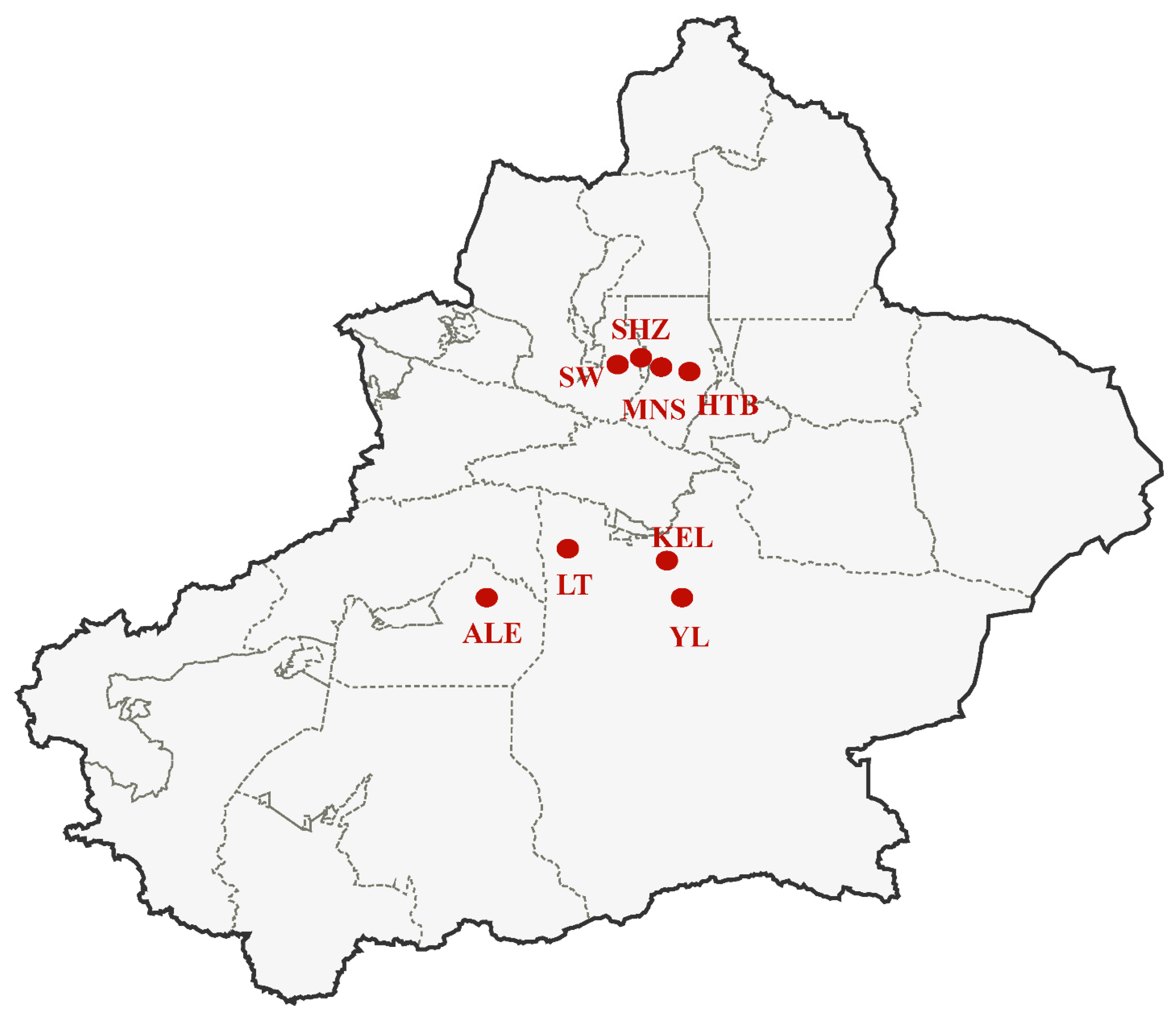 | SW | Shawan, Tacheng | 44°18′47″, 85°42′6″ | August 2023 |