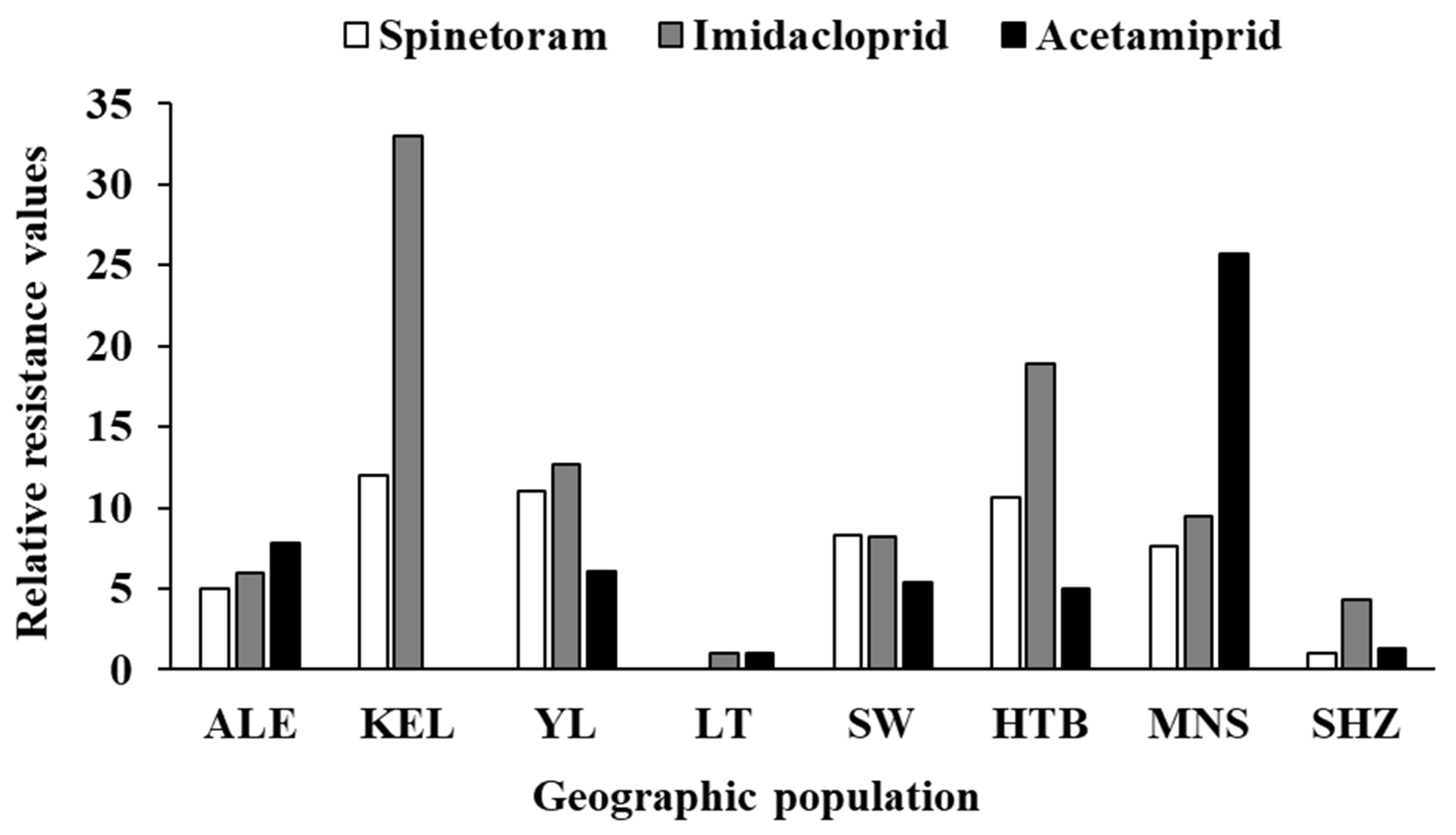 - Gao, Y.-F.; Gong, Y.-J.; Cao, L.-J.; Chen, J.-C.; Gao, Y.-L.; Mirab-balou, M.; Chen, M.; Hoffmann, A.; Wei, S.-J. Geographical and interspecific variation in susceptibility of three common thrips species to the insecticide, spinetoram. J. Pest. Sci. 2021, 94, 93–99. [Google Scholar] [CrossRef]