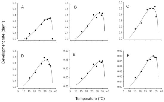Using these low temperature thresholds and setting the upper threshold at 36 °C (there was complete development at 35 °C and no survival at 36.7 °C), the Briere-2 nonlinear model provided a good fit to the data set for development for egg, larvae, pupa and egg to adult eclosion (Figure 1) and provides Topt as 25.8, 28.2, 28.9, 28.8, 31.6, and 29.7 °C for egg, fist instar, second instar, third instar, pupa and egg to adult eclosion, respectively.