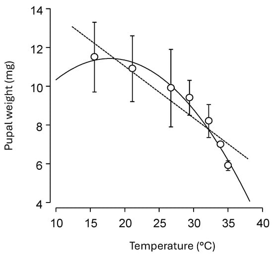 Weight of 3-day-old pupae ranged from 11.5 ± 1.8 mg at 15.6 °C to 5.9 ± 0.25 mg at 35 °C. Weight was negatively associated with increasing temperature using a linear model (y = 16.37 − 0.27x; R2 = 0.84, F = 33.19, df = 1.6, p = 0.002; Figure 2, dashed line). A simple quadratic equation better captured the decline in weight at both lower and upper temperatures to show a negative relationship with a sharp decline as temperatures reached the lethal limits (y = 5.78 + 0.629x − 0.018x2; R2 = 0.96, F = 1417.8, df = 3.7, p < 0.001; Figure 2, solid line).