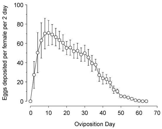 Adults had an average of 5.8 ± 0.9-day pre-ovipositional period and deposited an average of 1087.2 ± 199.5 eggs over the lifetime of 53.6 ± 10.2 days (Figure 3). Egg production reached a peak in about 10 days and steadily declined thereafter, with 80.9% of eggs deposited in the first 30 days of oviposition.