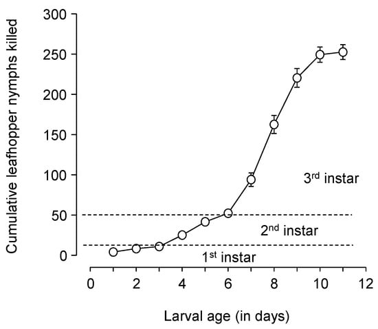 Larvae consumed or killed 252.6 ± 9.2 late-instar E. variabilis in an average 9.6 ± 0.2-day larval development period. More leafhoppers were consumed in the third instar (200.2 ± 8.6) than in the second instar (41.4 ± 3.0), which consumed more than the first instar (10.9 ± 1.2) (F = 371.02, DF = 2.39, p < 0.001; Figure 4).