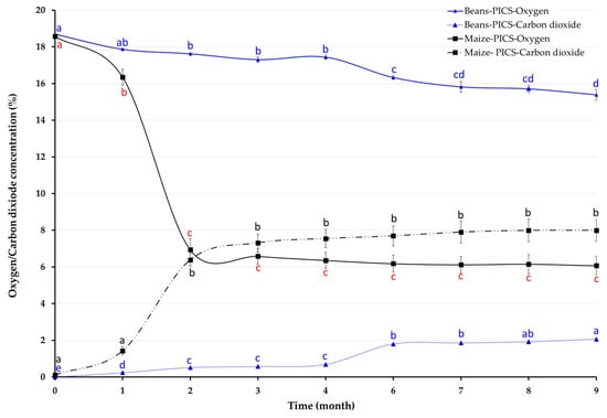 Oxygen and carbon dioxide concentration inside Purdue Improved Crop Storage (PICS) bags storing canary beans in Camaná and purple maize in Castilla for nine months, Arequipa region, Peru. Within each crop (line), monthly means of O2 or CO2 concentrations followed by different letters differ significantly at p < 0.05.