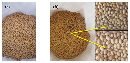 Canary beans stored for nine months in (a) Purdue Improved Crop Storage (PICS) and (b) polypropylene (PP) bags in Camaná, Arequipa region, Peru. Arrows show damaged beans.