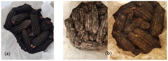 - Mold Colony-Forming Units: Fungal incidence was assessed only in purple maize due to its high susceptibility to mold under elevated moisture. Total mold counts were performed following the ICMSF serial dilution protocol (2000) at BHIOS Laboratories (https://bhioslabs.com/). A serial dilution of 10 g of grains collected from each replicate was performed on peptone water and plated in duplicates on Oxytetracycline–Glucose Yeast Extract Agar (OGYE) culture medium. The samples were incubated at 25 °C for 5 days in the dark. Mold and yeast colonies on each plate were observed, differentiated, and identified following the laboratory’s quality control protocols. The results were expressed in colony-forming units (CFU)/g. We made observations of colonies to determine the genus to which the mold belongs, following descriptive illustrations from [31]. These observations were made using an optical microscope, Primostar (Zeiss, Oberkochen, Germany).