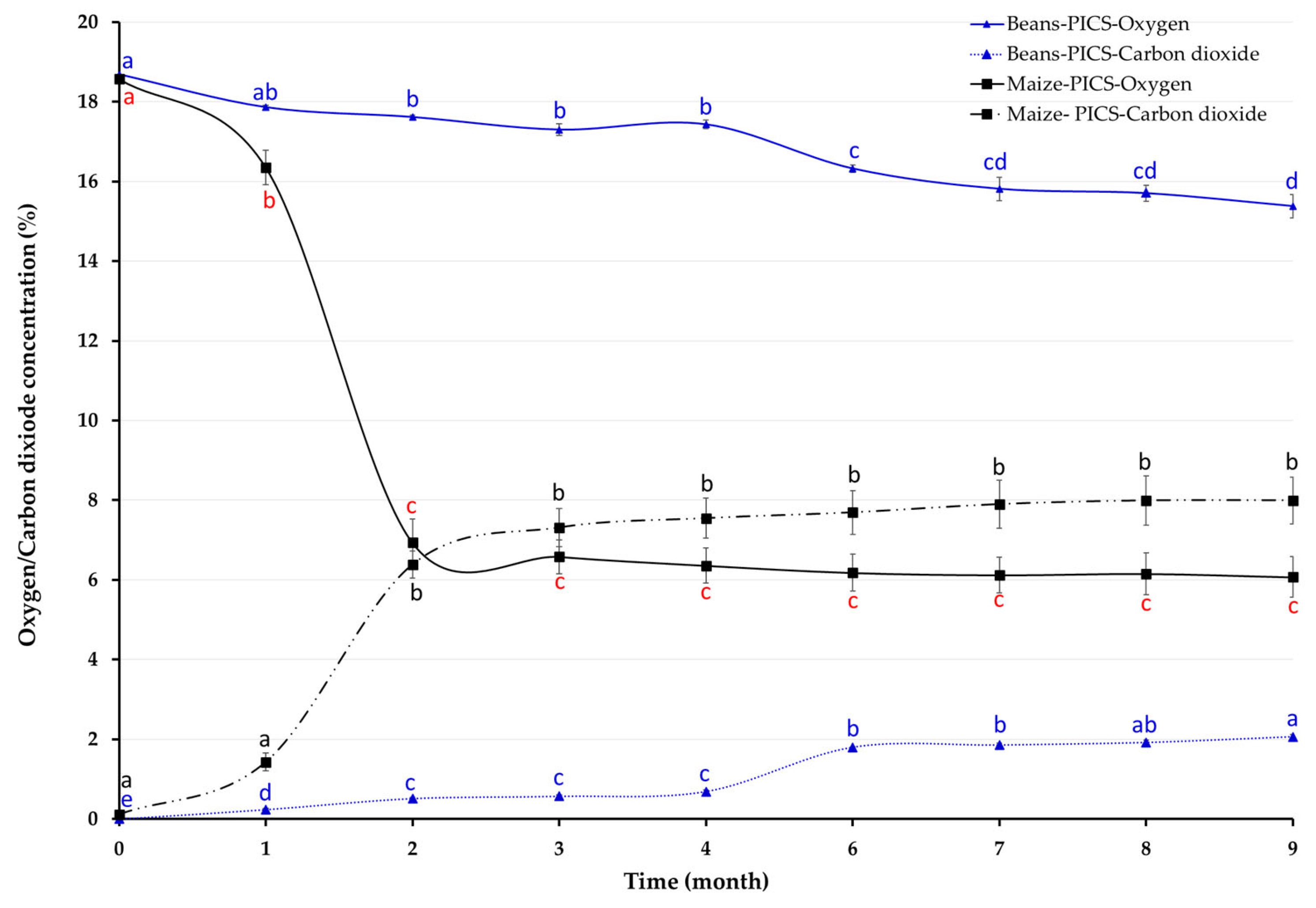 - Oxygen (O2) and carbon dioxide (CO2): The Mocon Pac Check® 325 device (Mocon, Minneapolis, MN, USA) was used to measure the O2 and CO2 levels in each replicate of the PICS and PP bags every month. This device measures the O2 and CO2 composition of a closed bag by extracting a small sample of air from the inside environment. The Mocon device uses a 20-gauge hypodermic needle to sample the gas inside the bag. For the PICS bag measurement, the outer bag was opened, and the inner liners were pierced near the top with the analyzer needle. The punctures were sealed with 10 mm adhesive pads and reinforced with packing tape after each reading. For subsequent measurements, the same site was accessed by briefly unsealing and then resealing the adhesive tape. PP bag measurements were taken at the same spots without sealing, as they are not airtight.