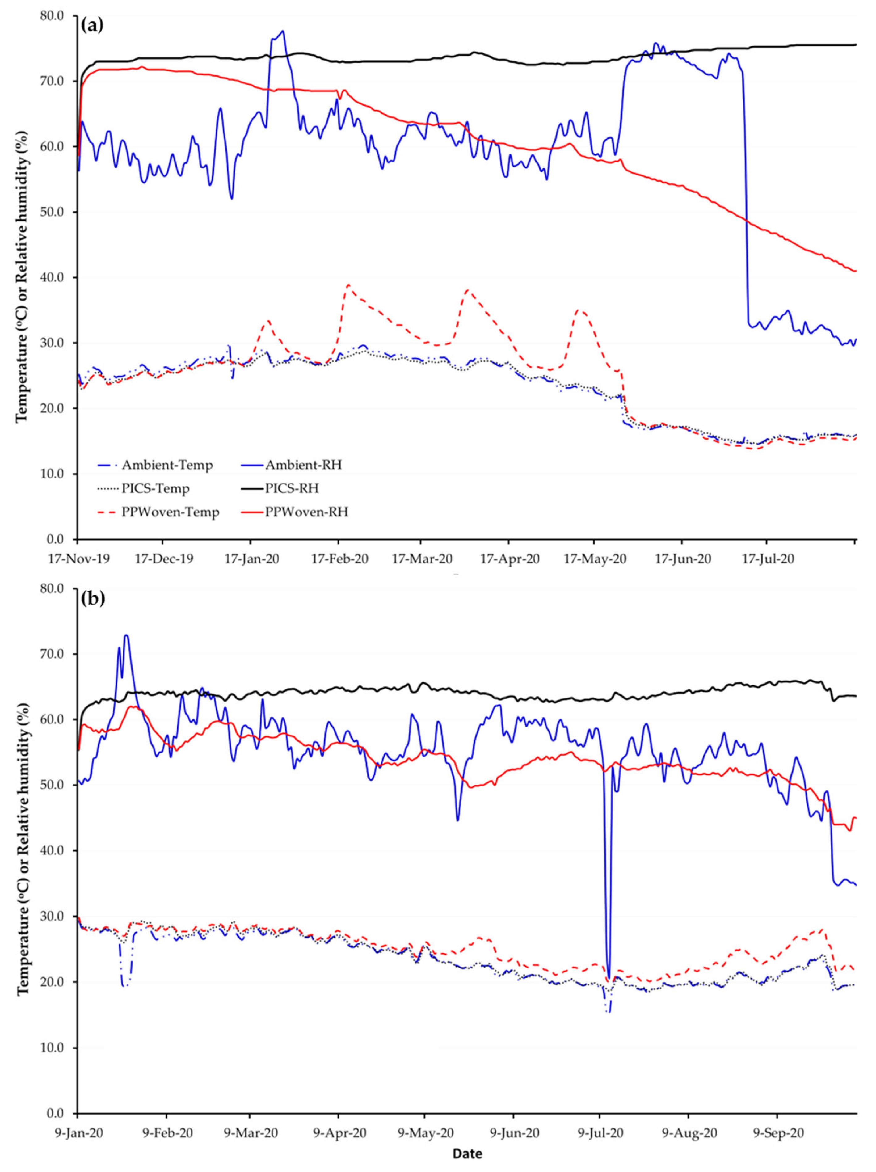 - Relative Humidity and Temperature: Relative humidity and temperature were recorded using EasyLog EL-USB-2 USB data loggers (Lascar, Erie, PA, USA). Data were recorded every 6 h throughout the storage period. Due to the limited number of data loggers, one was placed in a single replicate of each treatment and in the room where the experiments were conducted (ambient) to monitor environmental conditions inside and outside of the bags during the experiment.