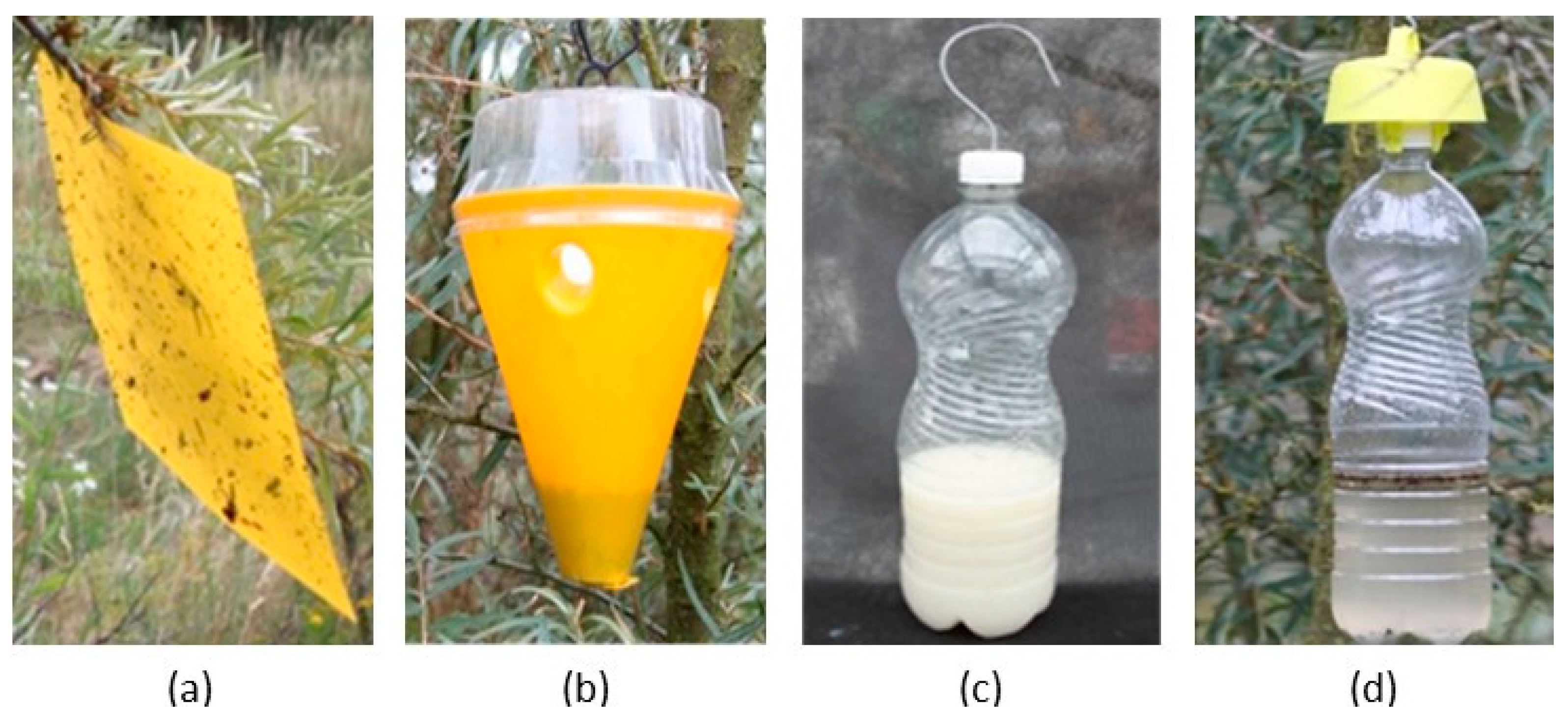 - Stalažs, A.; Dēķena, D.; Zukure, I. Atraktanta izmantošanas iespējas smiltsērkšķu raibspārnmušu (Rhagoletis batava) pievilināšanā. Prof. Dārzkopība 2023, 18, 23–31. [Google Scholar]