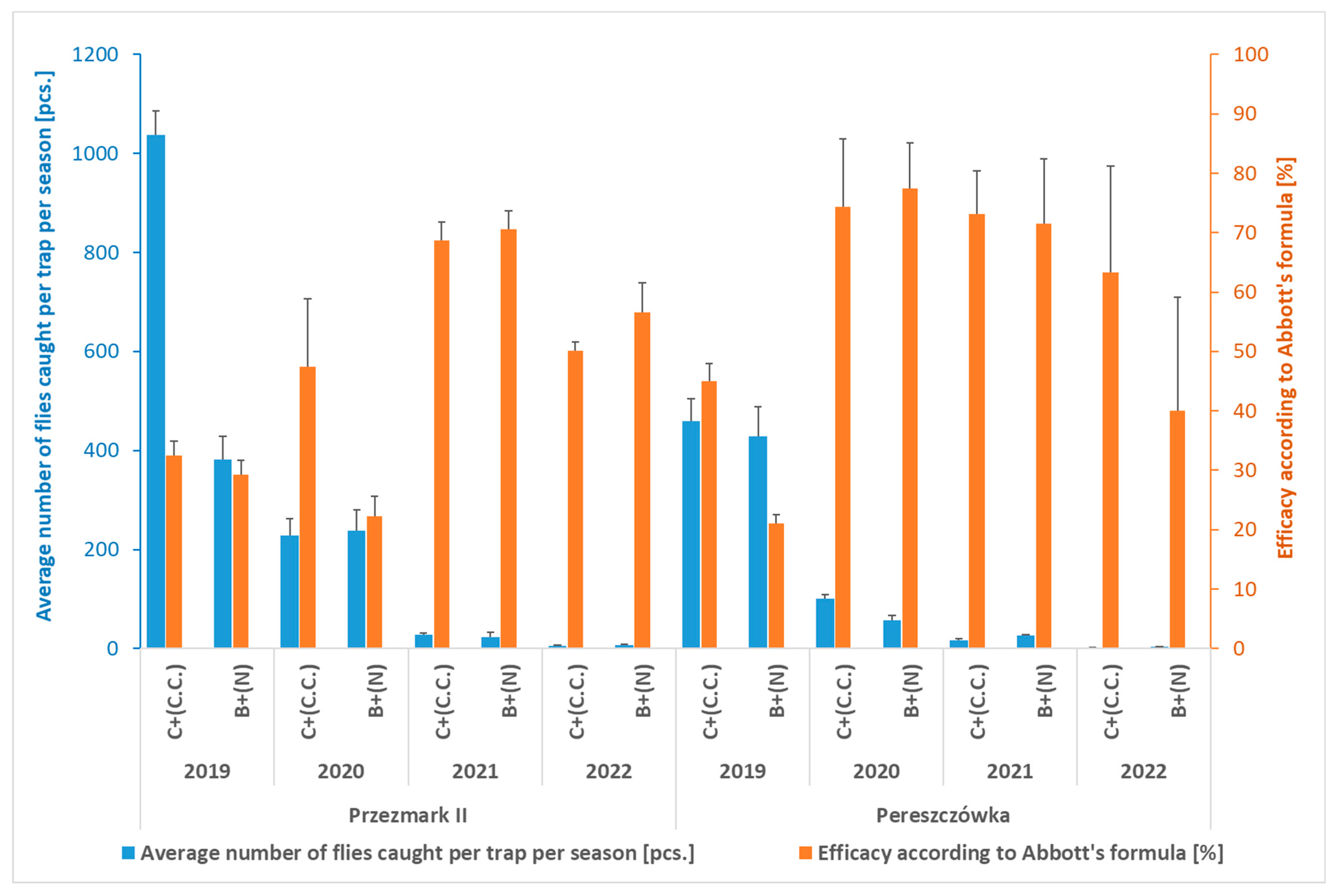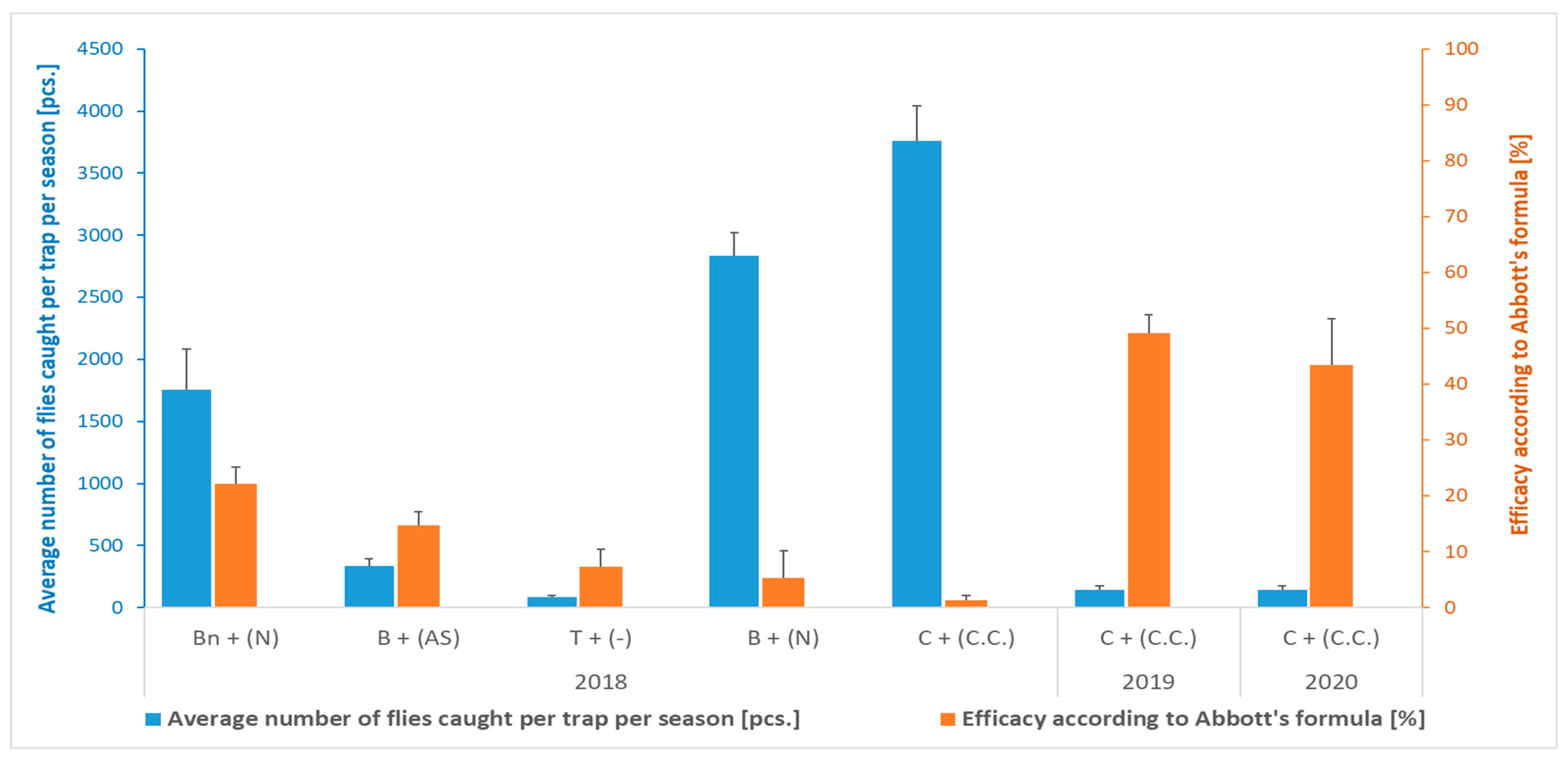 | Control (without traps) | 75.2 ± 6.4 c | 15.8 ± 3.6 b | 16.7 ± 3.7 b | 22.5 ± 3.7 b |