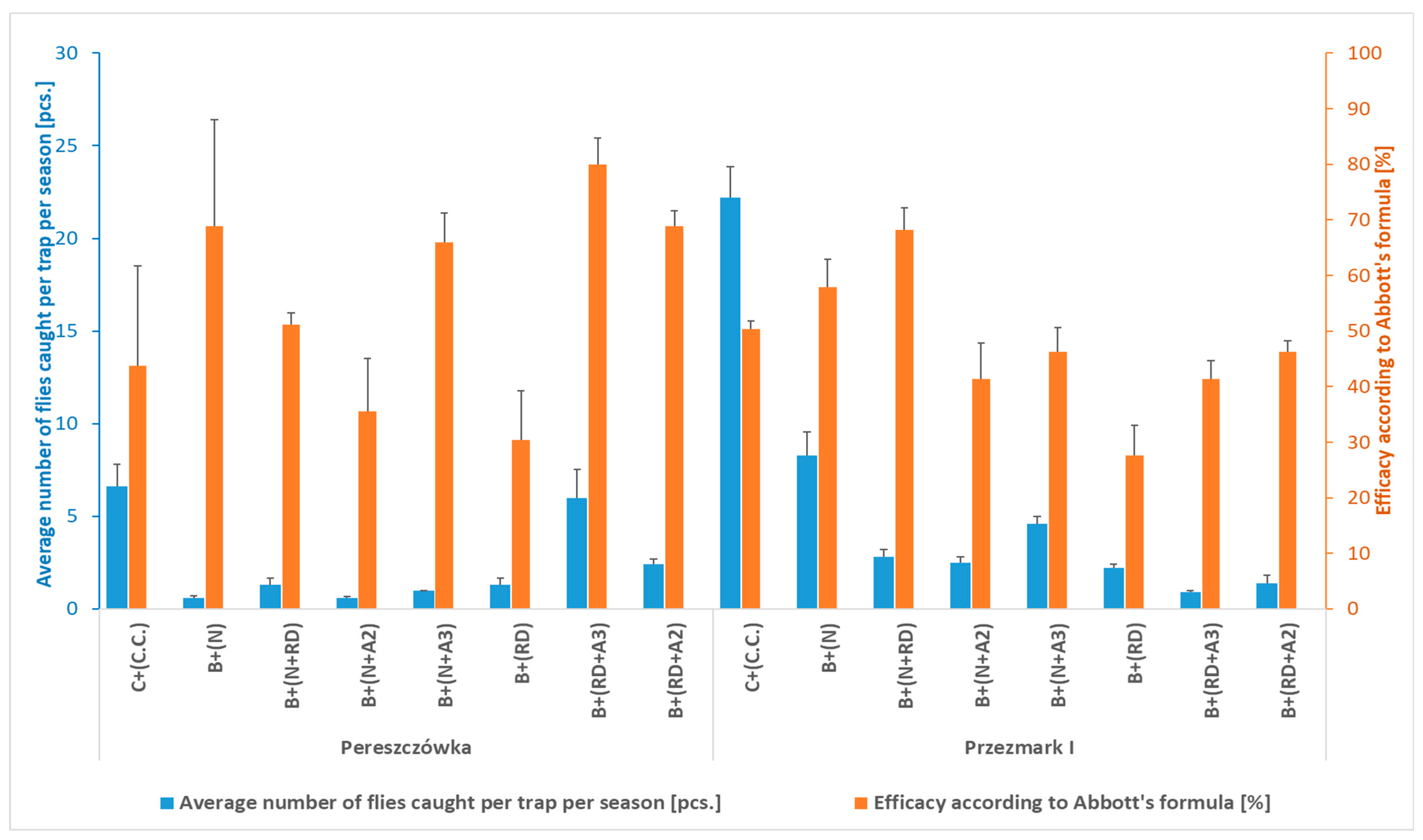| Control (without traps) | 100.0 ± 0.0 c | 81.5 ± 3.1 b | 92.3 ± 5.6 b |