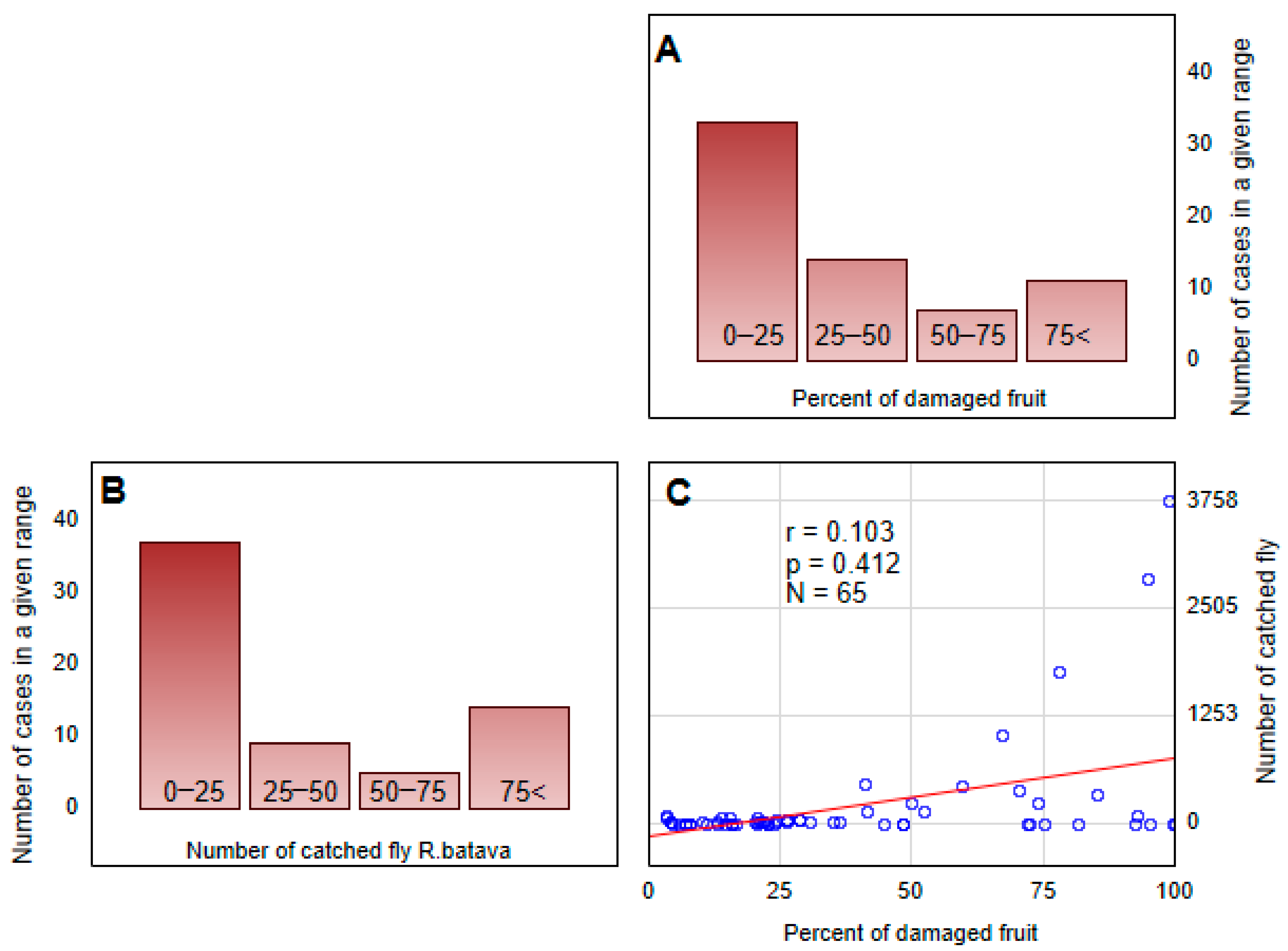 3.3. Assessing the Relation Between Trapped Flies and Damaged Fruits