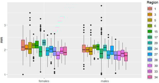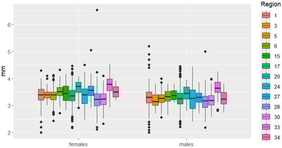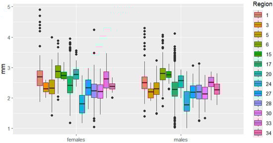 This is clearly demonstrated in Figure 3, Figure 4, Figure 5, Figure 6, Figure 7 and Figure 8. It is immediately apparent that females were larger than males in all regions. This indicated that the studied species exhibited a clearly defined SSD. Outliers are most frequent in the Republic of Tatarstan and Kaluga Oblast, which also have the largest samples, making extreme trait sizes more likely to be detected.