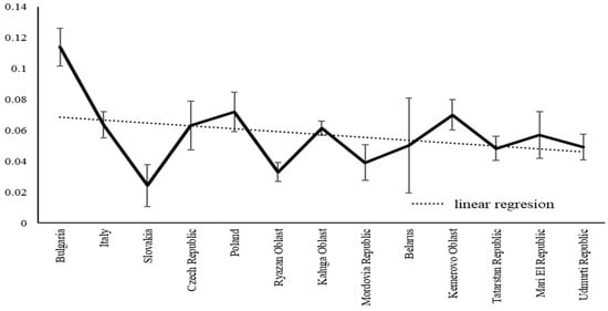 Furthermore, significant differences in size variability were observed across regions for individuals of both sexes. For example, elytra length varied significantly between females in Mari El, Belarus, Kaluga, Bulgaria, while it was approximately the same for males. In Mordovia and Ryazan regions, that trait did not differ between females, but it differed significantly between males.