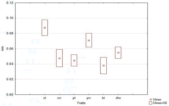 We calculated the SSD values for the entire C. granulatus sample and found that the SSD for different traits within the same species exhibited statistically significant differences: the largest SSD was observed for elytra length, and approximately the same for pronotum width. For the remaining linear traits, it was statistically significantly smaller (Figure 11).