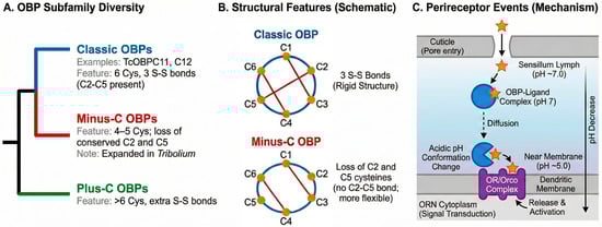 Overview of OBP Diversity, Structural Features, and Functional Mechanism. (A) Phylogenetic diversity showing the main OBP subfamilies. Classic OBPs typically have 6 conserved cysteines. Minus-C OBPs (expanded in Tribolium) are characterized by the loss of the conserved C2 and C5 cysteines. Plus-C OBPs carry additional cysteines. (B) Schematic comparison of Classic vs. Minus-C OBP structures. Classic OBPs possess 6 cysteines forming 3 rigid disulfide bonds (red lines). Minus-C OBPs have lost the ancestral C2 and C5 cysteines, and therefore lack the C2–C5 disulfide bond, resulting in a potentially more flexible structure (dashed outline). (C) Schematic model of perireceptor events. Hydrophobic odorants (orange stars) bind to OBPs at neutral pH and are released to the Olfactory Receptor (OR) complex in the acidic environment near the dendritic membrane.