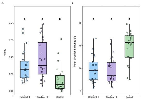 The individual directional strength, quantified by the Rayleigh r value, varied significantly across the three treatment conditions in the 23 moths tested across all phases (Friedman test, p < 0.01). Individuals showed a significantly higher r value under both gradient panel conditions (Gradient-I and Gradient-II) compared to the uniform control panel, with no significant difference found between the two gradient orientations (Figure 3A, Table A2; Paired Wilcoxon signed-rank tests).