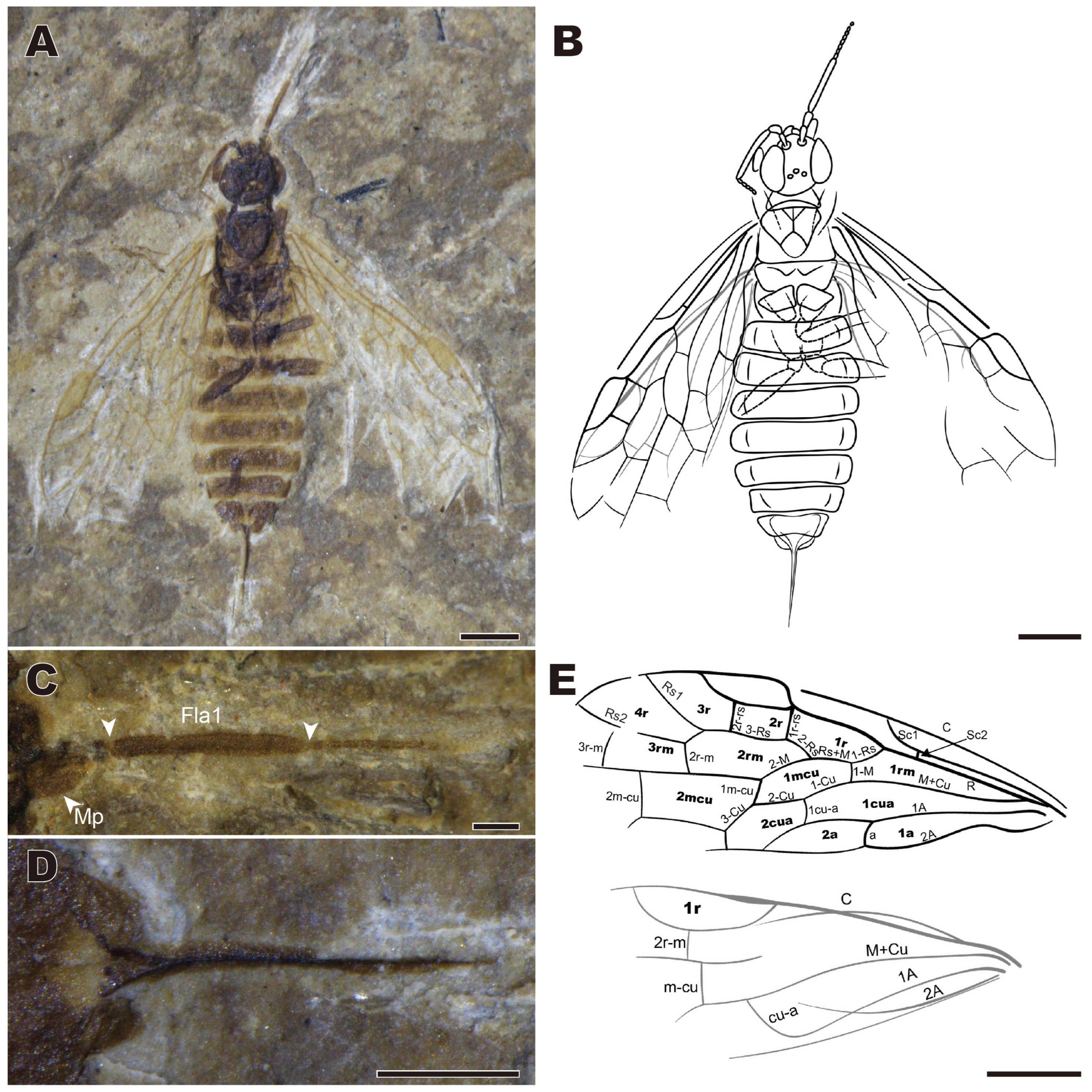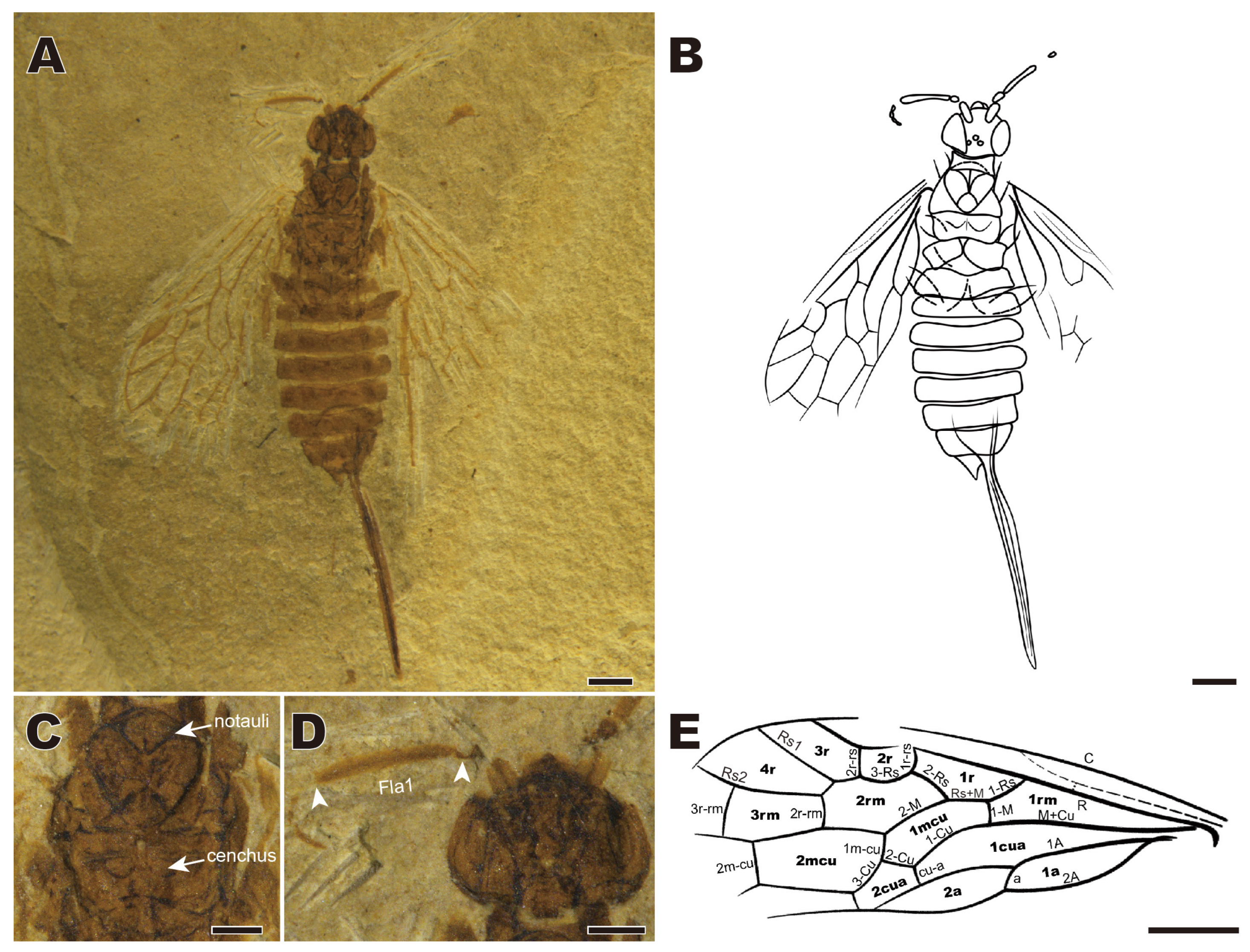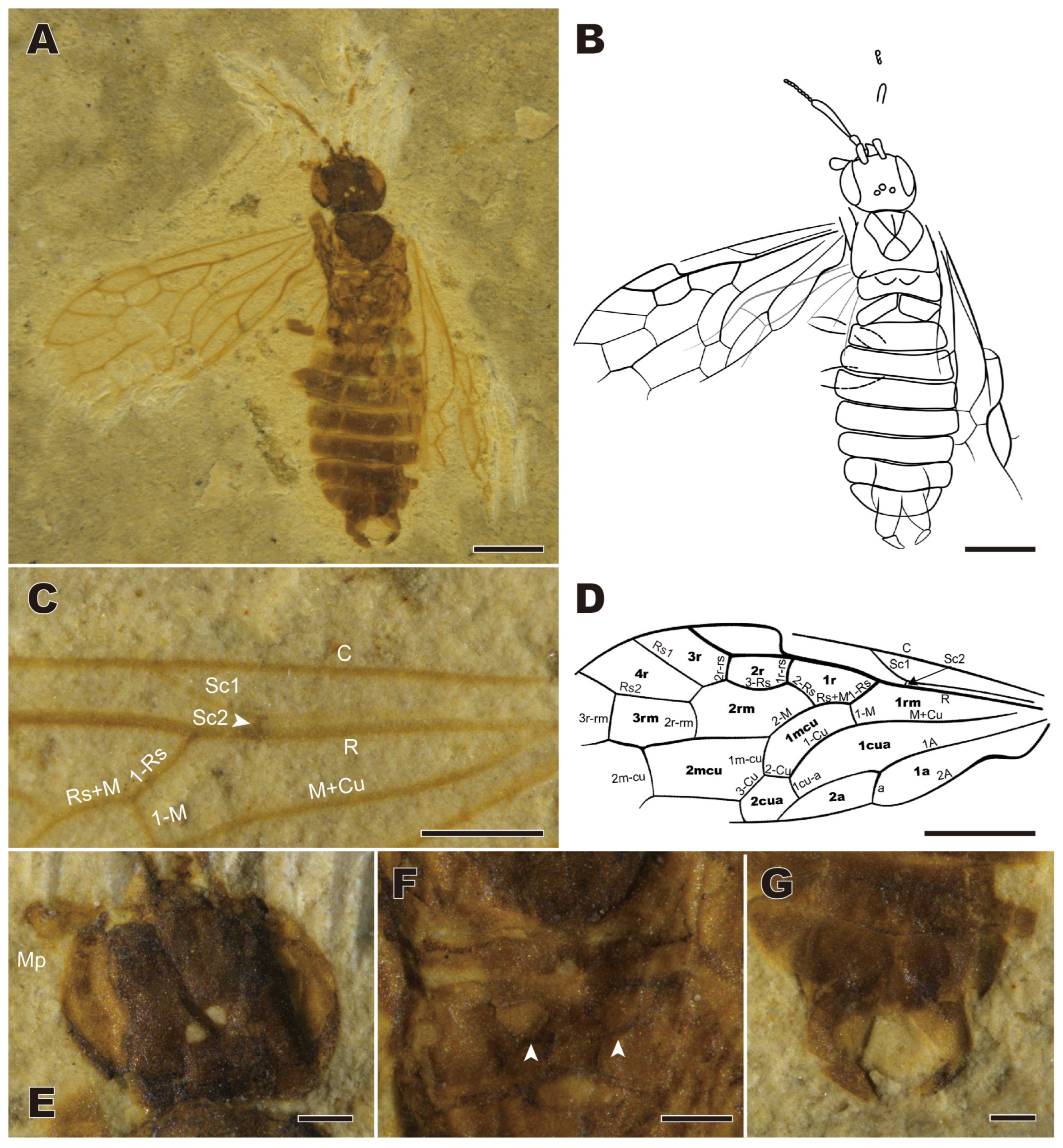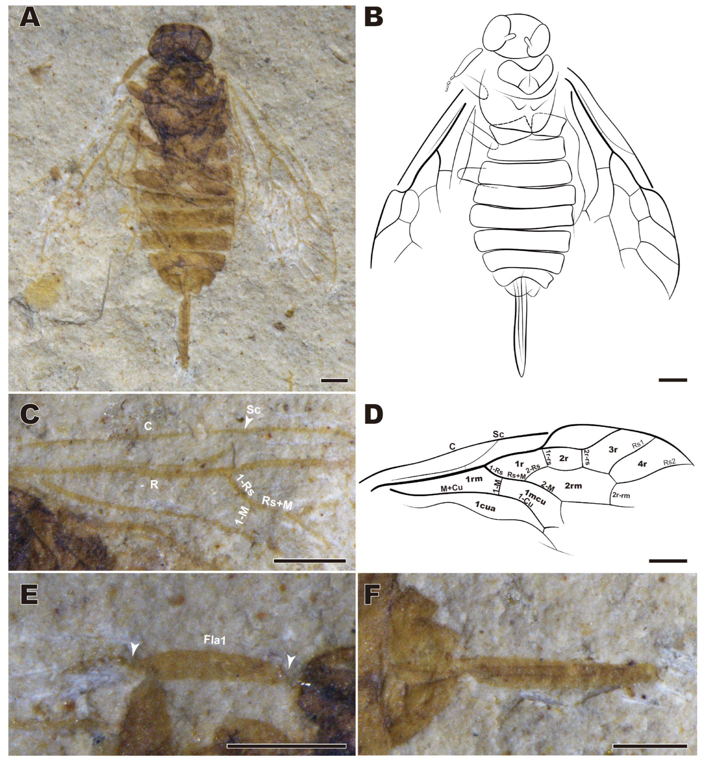 - Flagellomere 1 shorter than half the head width. Sheath 0.38× as long as forewing. ··············································· E. pinicola (Rasnitsyn in Krassilov et Rasnitsyn, 1982)