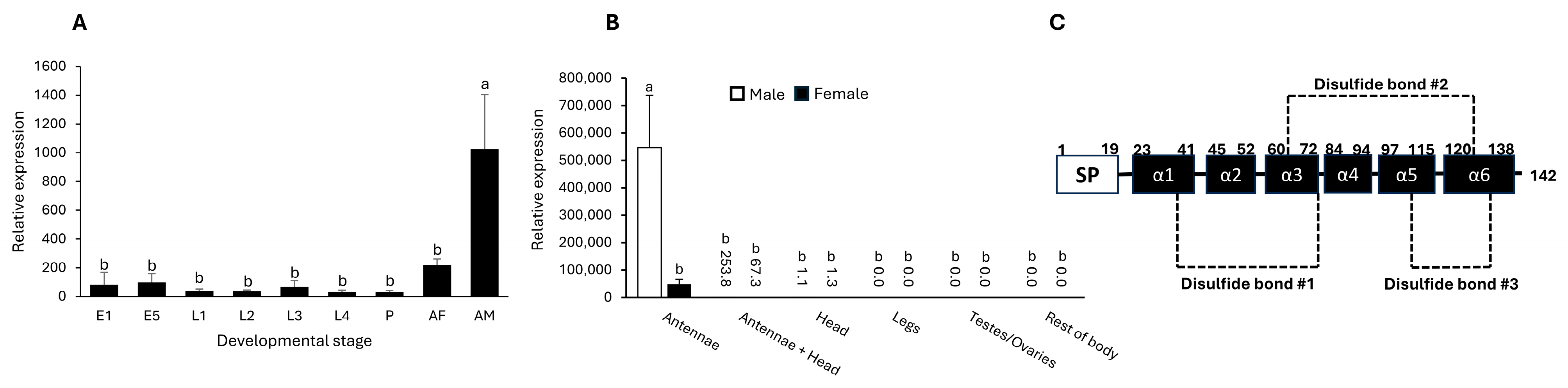 3.1. Expression Patterns of LdecOBP33 and Bioinformatic Analyses