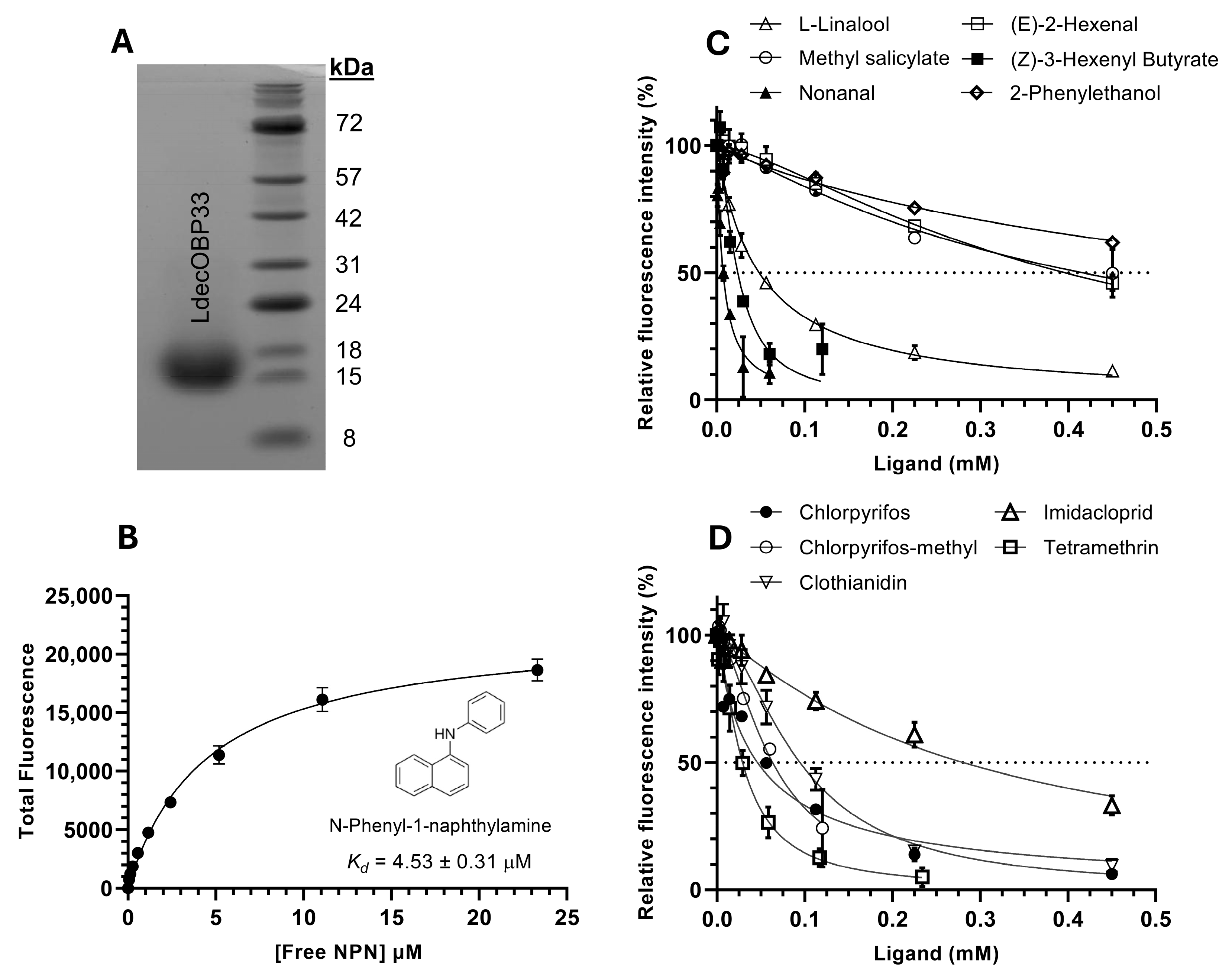 - D’Onofrio, C.; Zaremska, V.; Zhu, J.; Knoll, W.; Pelosi, P. Ligand-binding assays with OBPs and CSPs. In Methods in Enzymology; Pelosi, P., Knoll, W., Eds.; Academic Press: Cambridge, MA, USA, 2020; Volume 642, pp. 229–258. [Google Scholar] [CrossRef]