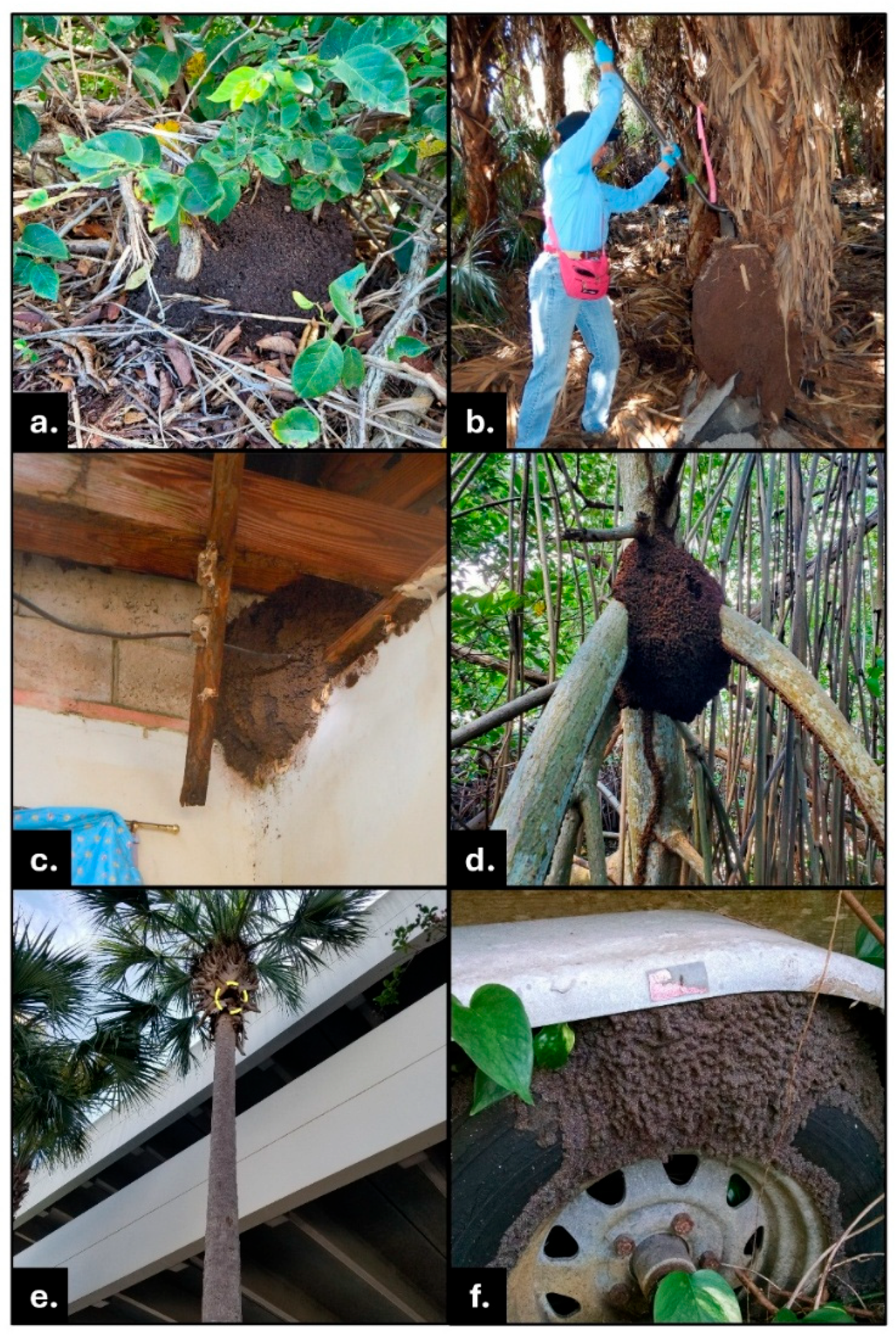 12]. The Florida Department of Agriculture and Consumer Services (FDACS) invasive conehead termite eradication program, intensified since 2012, has worked in diverse infested areas and habitats in Dania Beach, Davie, Pompano Beach, and Ft. Lauderdale (all in Broward County, Florida). Locations vary across natural, residential, and commercial properties; some wooded, others with managed landscapes; mangroves; and some along other canals or roadsides [