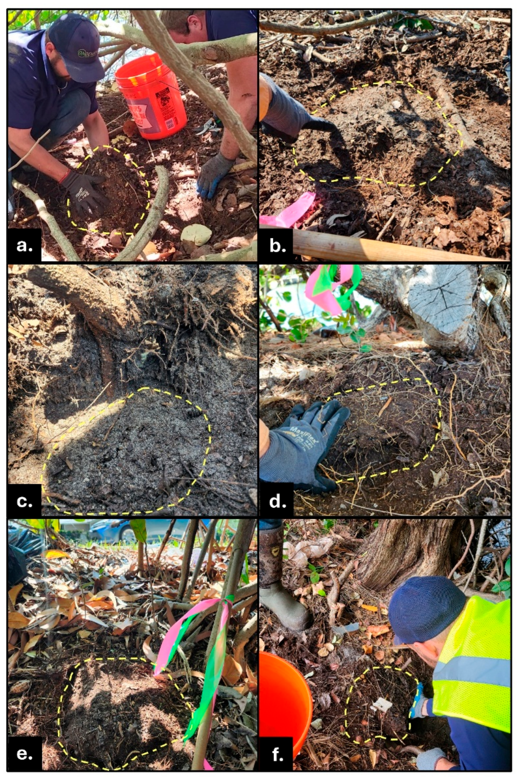 Underground activity was discovered by experienced invasive conehead termite field team members who noticed lots of active, above-ground foraging tunnels in these areas, but no visible nests. That circumstance is reasonably common even within N. corniger’s “native” range. The termites may nest hidden within a tree trunk, branch, stump, or root. In the Airport and Old Griffin Road habitats, however, and within a wide radius of the Ft. L I-95 site underground nest, suspicions of novel nesting locations were raised following careful inspections.