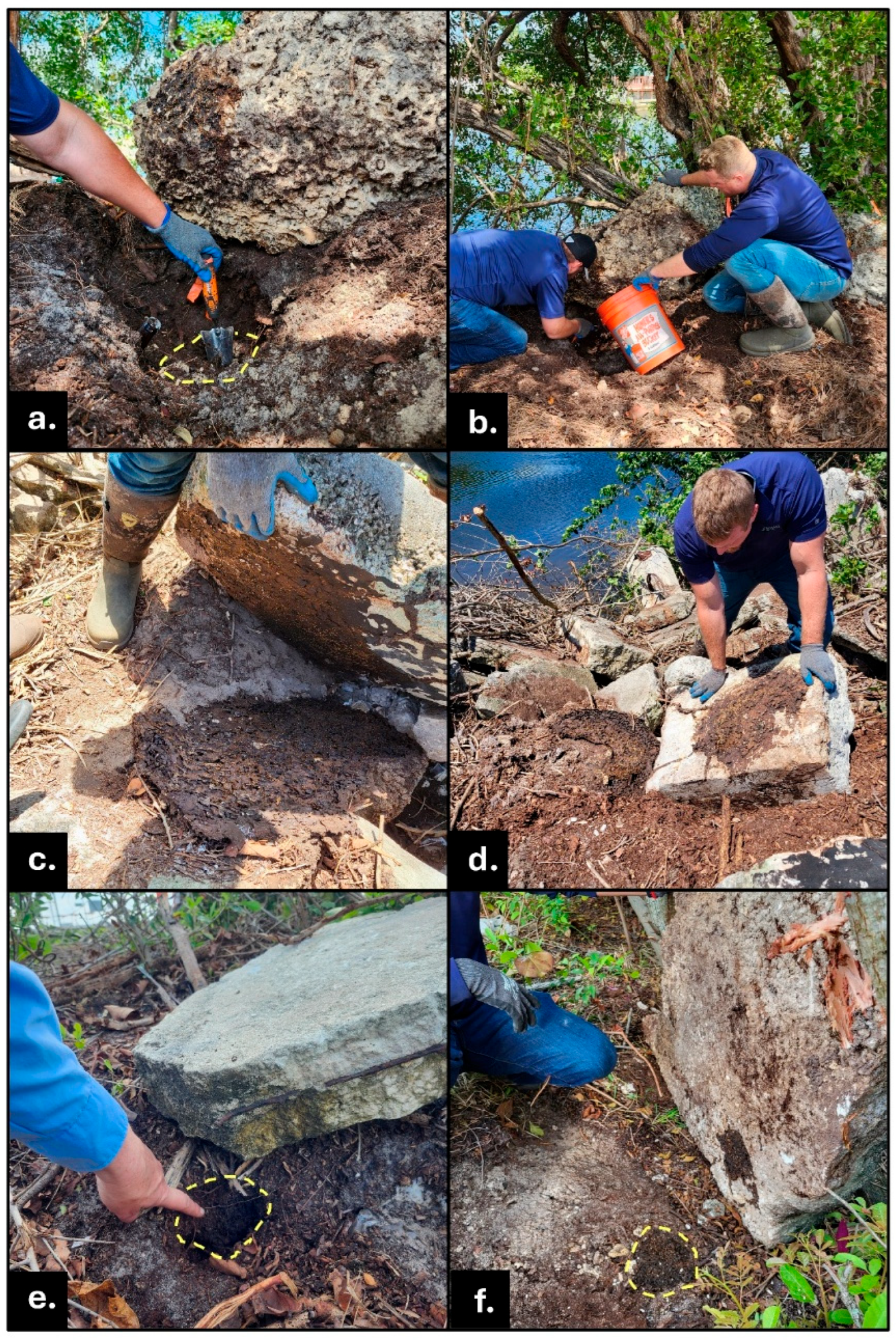Thick, twisted roots and branches create open voids and cavities in the soil anchoring trees. Undercuts and contours occur—and change over time—in both canal bank’s soil due to erosion and silt from tide, boat, and storm surge currents. The Airport site has large trees including sea grape (Coccoloba uvifera), tropical almond (Terminalia catappa), Brazilian peppertree (Schinus terebinthifolius), red mangrove (Rhizophora mangle), sabal palm (Sabal palmetto) and coconut palm (Cocos nucifera). Some of the undergrowth plants are previously dense thickets of coinvine (Dalbergia ecastaphyllum), various tall grasses, and weedy forbs. To aid in the invasive termite surveillance and treatment protocols, regular maintenance on the densest areas of undergrowth have occurred in the past several years leaving zones of pruned, decomposing vegetation and leaf litter on much of the Airport bank surface.