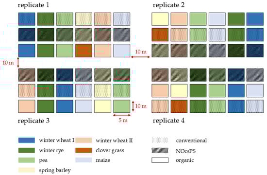Experimental design of the six-year crop rotation study in harvest year 2020/2021 for organic, NocsPS, and conventional management systems. Dotted areas in the figure represent conventional plots, striped areas represent NOcsPS plots, and blank areas represent organic plots.