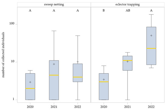 This effect was less pronounced in the sweep netting collections. Fewer individuals were collected in 2020 (total = 50; mean ± SD: 1.52 ± 0.87) compared with the following years, while the number of individuals in 2021 (total = 194; mean ± SD: 3.66 ± 6.33) and 2022 (total = 173; mean ± SD: 3.84 ± 5.03) differed only slightly.