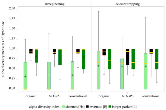 Effects of management systems on alpha diversity measures as determined by sweep netting and eclector trapping. Results were generalized with linear models (GLMMs) using ‘management system’ as a fixed effect and ‘year’, ‘collection date’, and ‘replicate’ as random effects on the diversity indices of Hybotidae. The yellow middle line represents median values. The upper and lower lines represent the first and third quartiles. The lower and upper hinges represent maximum and minimum values. ‘+’ represents the mean value. For better visualization, the y-axis was scaled logarithmically.