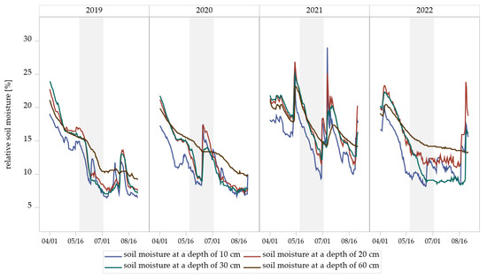 The soil moisture was measured using the soil sensor device of the weather station (Umwelt-Geräte-Technik GmbH Müncheberg, Müncheberg, Germany) at the experimental field site of the Julius Kühn-Institute in Dahnsdorf. Three sensors were used, which recorded the moisture every 10 min in 10 cm, 20 cm, 30 cm, and 60 cm soil depth.
