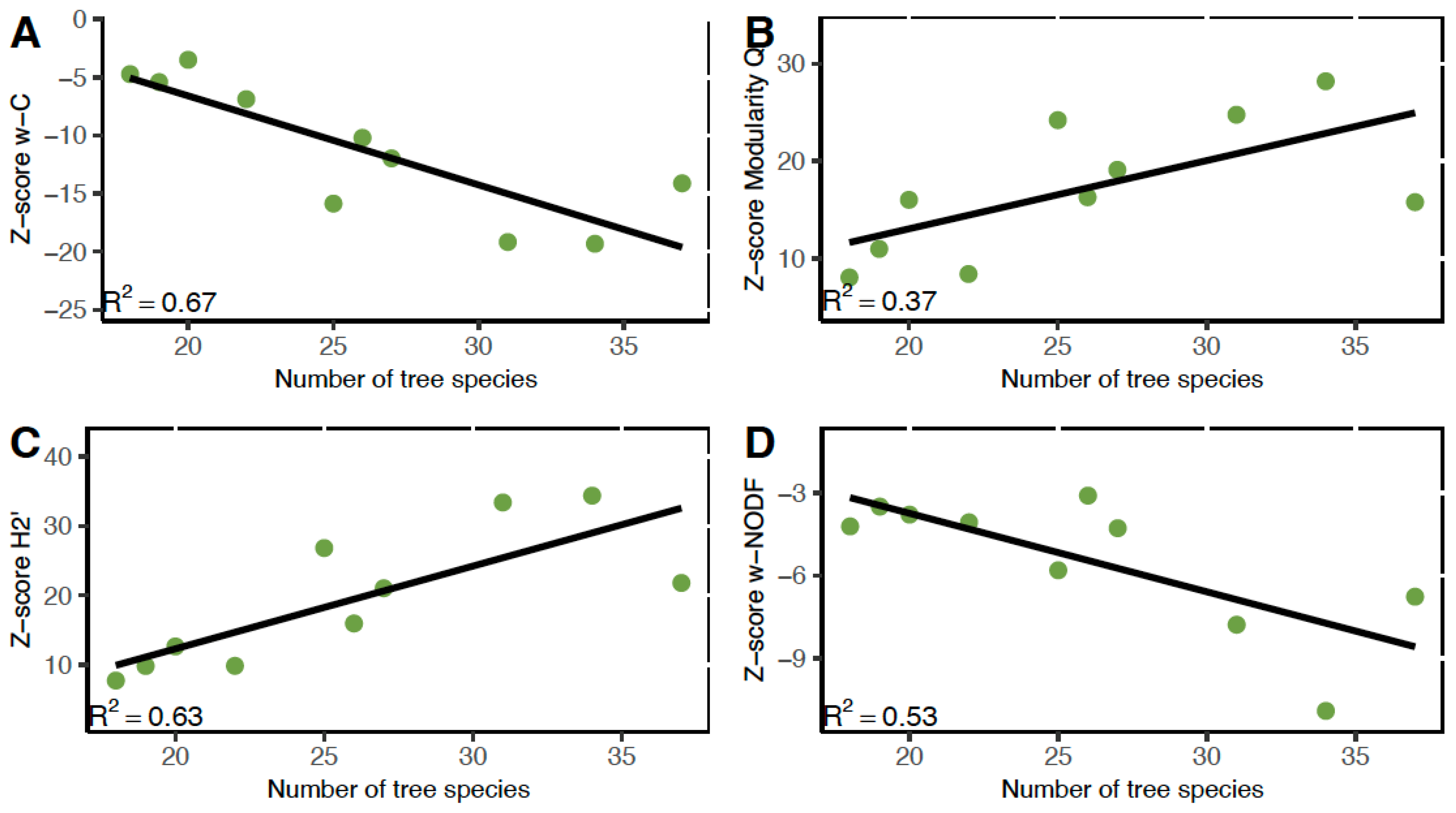 - The weighted connectance (w-C) algorithm was used to obtain a measure of network connectance, or the sum of all realized links in a network divided by the possible links [53]. Its values range between 0 and 1, with higher values indicating increases in realized interactions.