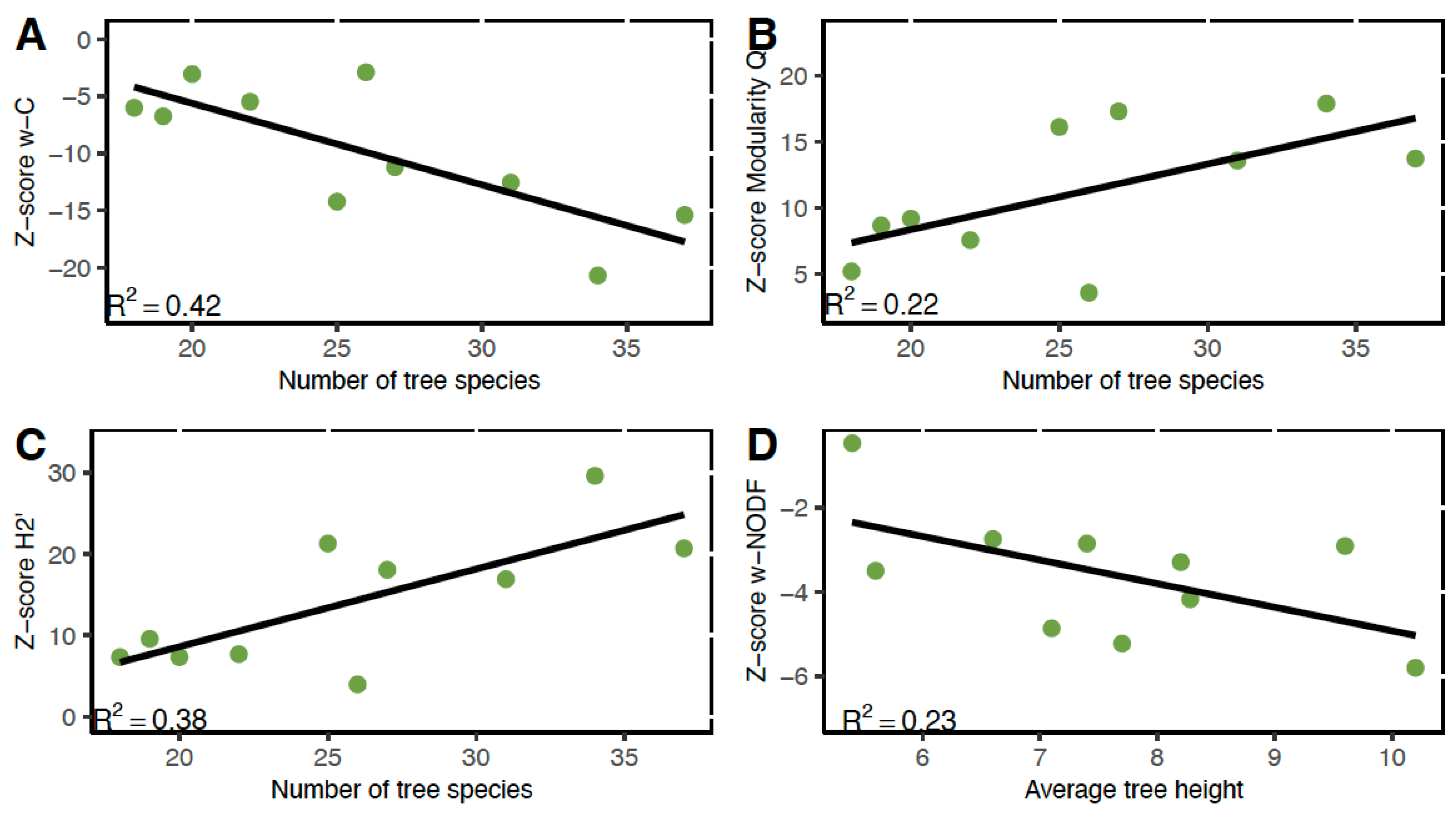 - H2′ was used to quantify specialization in each network [55]. Its value characterizes the average degree of specialization between the species in the entire network. H2′ values range from 0 to 1, with higher values indicating higher network specialization.