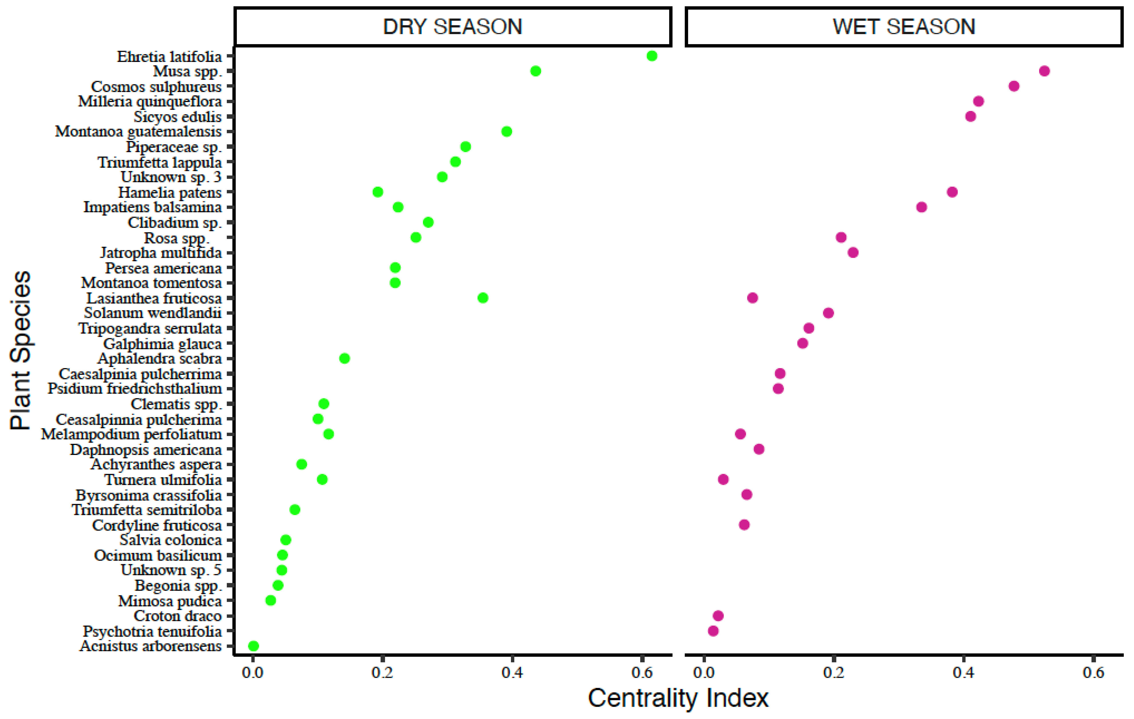 - Hinton, C.R.; Peters, V.E. Plant Species with the Trait of Continuous Flowering Do Not Hold Core Roles in a Neotropical Lowland Plant-Pollinating Insect Network. Ecol. Evol. 2021, 11, 2346–2359. [Google Scholar] [CrossRef] [PubMed]