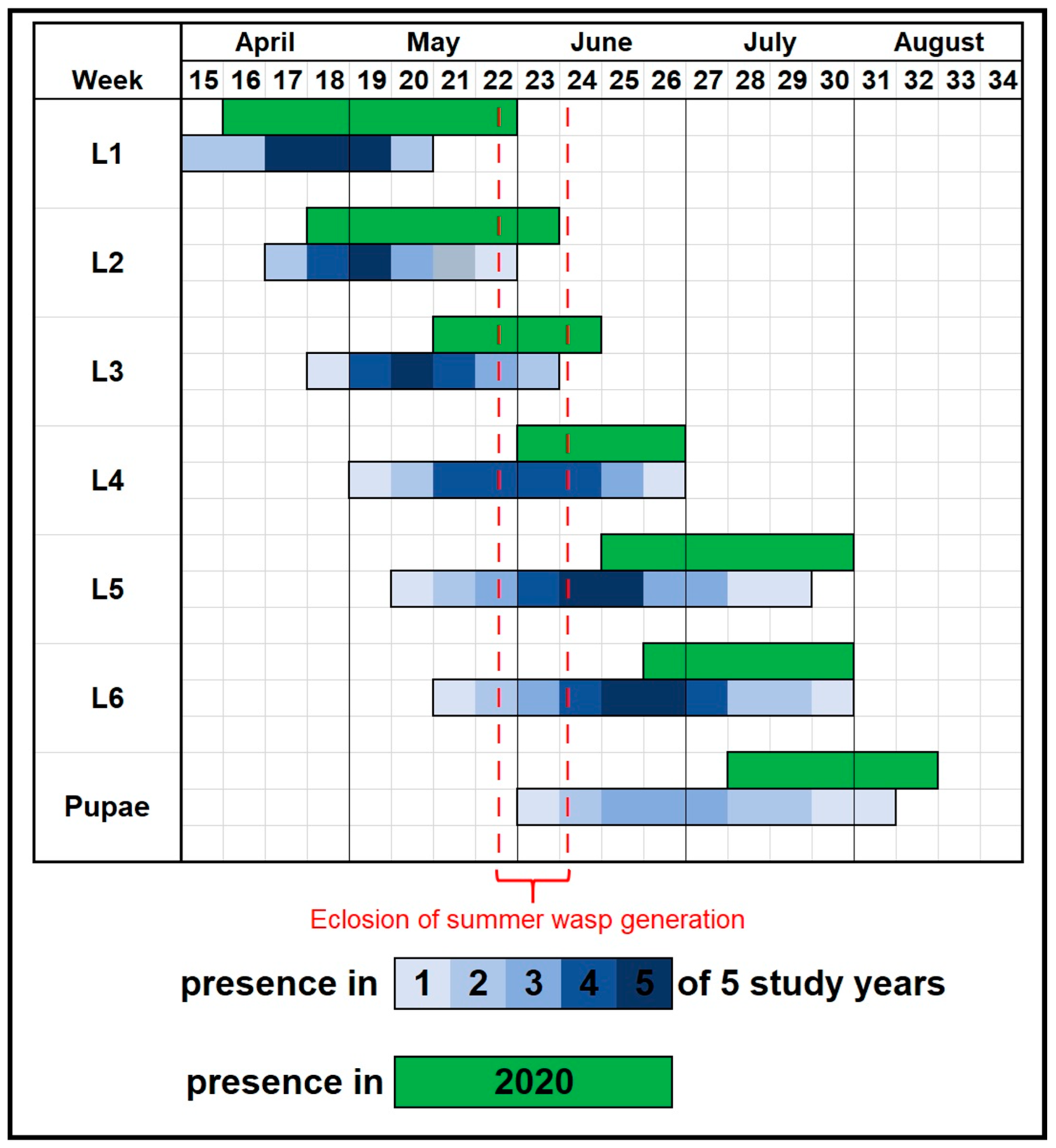 - Nussbaumer, C.; Schopf, A. Development of the solitary larval endoparasitoid Glyptapanteles porthetriae (Hymenoptera: Braconidae) in its host Lymantria dispar (Lepidoptera: Lymantriidae). Eur. J. Entomol. 2000, 97, 355–361. [Google Scholar] [CrossRef]