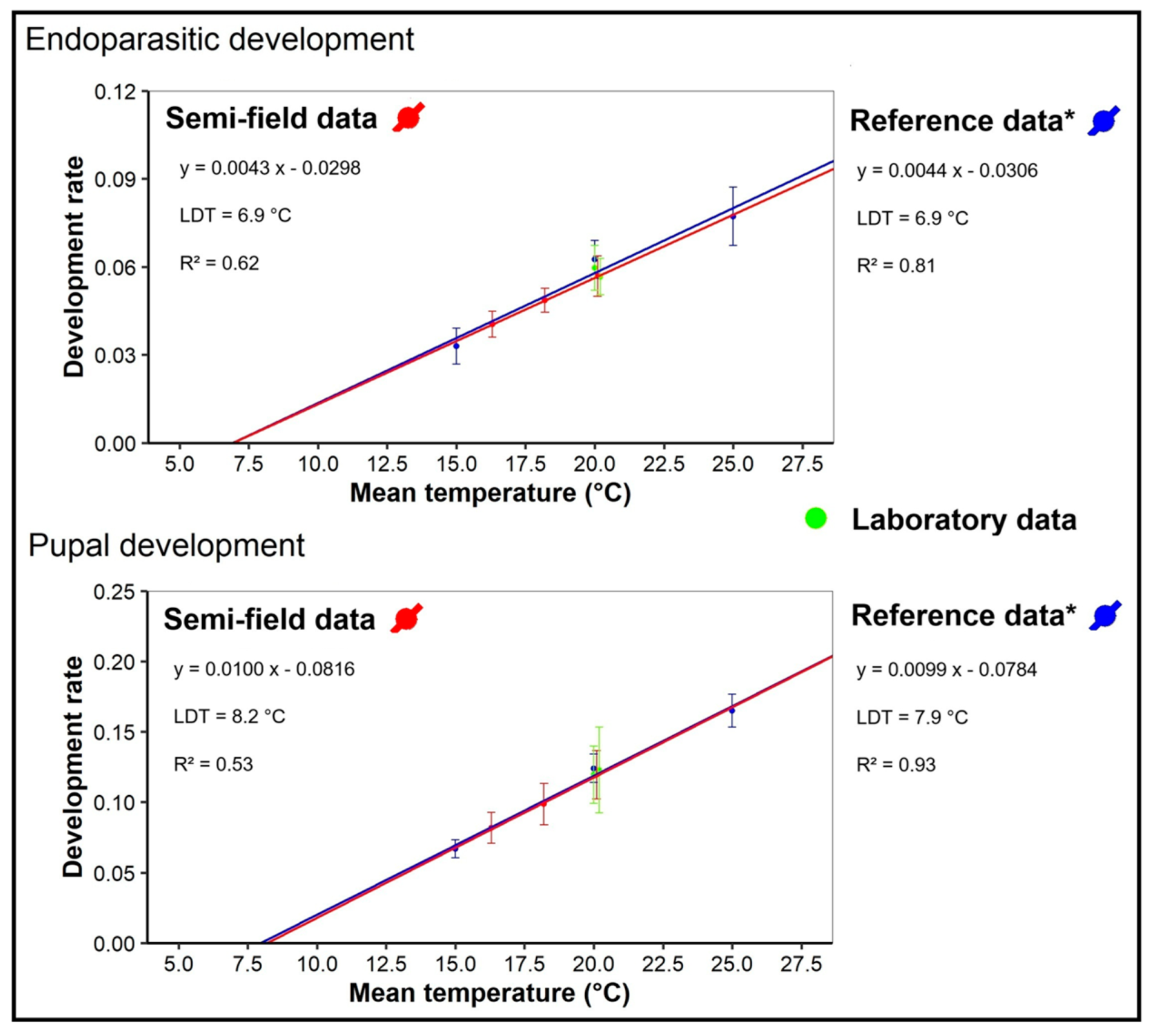 | Pupal development (days) | 8.5 ± 1.3 a | 10.4 ± 1.6 b | 12.5 ± 1.8 c | < 0.001 |