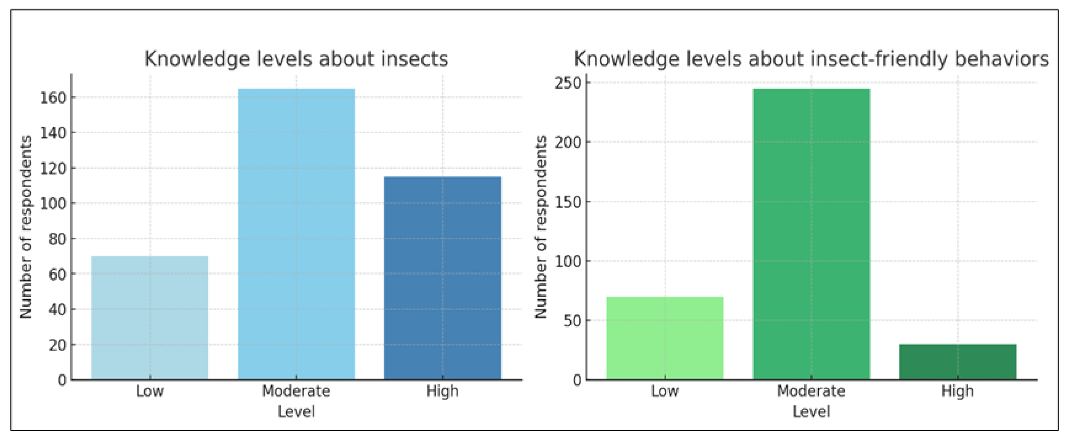 109], which assumes that individuals possess the necessary knowledge but fail to act upon it. In contrast, the results of this study indicate a more fundamental knowledge deficit: respondents did not demonstrate a clear understanding of what specific actions are required to protect insects. While general awareness of the ecological importance of insects was moderate to high, knowledge of concrete, insect-friendly conservation practices was markedly low. Misconceptions, such as the belief that beekeeping can reverse insect decline or that only two bee species exist, were widespread, reflecting limited exposure to accurate information.