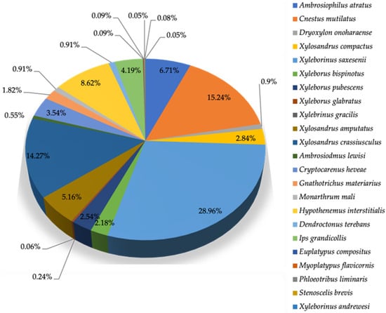Between 8 July 2022 and 25 October 2023, a total of 1594 pine bark and ambrosia beetles were captured in Leon County, representing 24 species and 18 genera across eight tribes: Xyleborini, Corthylini, Cryphalini, Hylurgini, Ipini, Onycholipini, Platypodinae, and Ploeotribini. The taxonomic placement of most captured beetles followed the classification system outlined by Haack & Rabaglia [49] The frequency distribution of these species is summarized in Table 1 and illustrated in Figure 2, showing a wide variation in species abundance ranging from 0.06% to 28.96%.