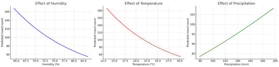 Marginal effects of climatic variables on insect abundance in Leon County based on a Poisson Generalized Linear Model (GLM). Predicted insect counts decreased with increasing relative humidity (left) and temperature (center), while precipitation exerted a positive effect, with insect abundance gradually increasing as rainfall increased (right).