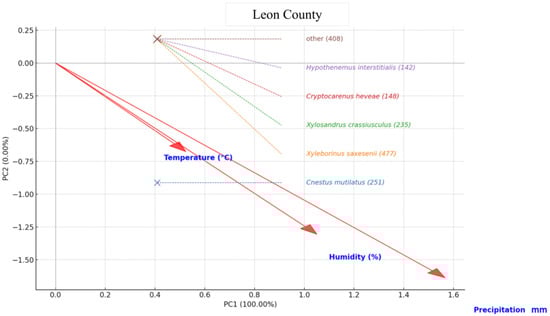 Principal Component Analysis (PCA) biplot showing the relationship between pine bark beetle species abundance and climatic variables (Temperature (°C), Humidity (%), and Precipitation (mm)) in Leon County. The species names are presented with their total abundance in parentheses, while red arrows indicate the direction and magnitude of climatic variables’ influence on species distribution.