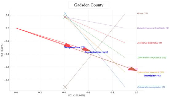 In Gadsden County, the PCA indicated that moisture, particularly relative humidity and closely followed by precipitation, was the dominant environmental factor affecting beetle assemblages. Xyleborinus saxesenii showed the strongest association with high humidity and rainfall, reflecting a clear preference for wetter conditions. Xylosandrus amputatus and Xyleborus bispinatus displayed moderate alignment with this same moisture gradient, while Xylosandrus compactus also occupied the wet-climate quadrant but with weaker influence due to its lower abundance. Hypothenemus interstitialis plotted near the ordination center, indicating broad tolerance or limited climatic sensitivity. The mixed “Other” category showed only modest association with moisture, consistent with its heterogeneous species composition. Overall, the Gadsden assemblage suggests that humid, rainy periods disproportionately favor X. saxesenii and, to a lesser extent, X. amputatus, X. bispinatus, and X. compactus, highlighting moisture as the key driver of species activity in this county (Figure 7).