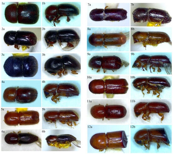 Dorsal and lateral habitus of collected and identified beetles (A. lewisi 1a,1b), (A. astratus 2a,2b), (C. mutilatus 3a,3b), (C. distinguendum 4a,4b), D. onoharaense 5a,5b), (X. andrewesi 6a,6b), (X. gracillis 7a,7b), (X. saxesenii 8a,8b), (X. bispinatus 9a,9b), (X. glabratus 10a,10b), (X. pubescens 11a,11b), (X. amputatus 12a,12b), (C. heaveae 13a,13b), (G. materiarius 14a,14b), (M. mali 15a,15b), (H. interstitialis 16a,16b), (D. terebrans 17a,17b), (I. grandicollis 18a,18b), (S. brevis 19a,19b), (E. compositus 20a,20b), (M. flavicornis 21a,21b), (P. liminaris 22a,22b), (X. crassiusculus 23a,23b), (X. compactus 24a,24b).