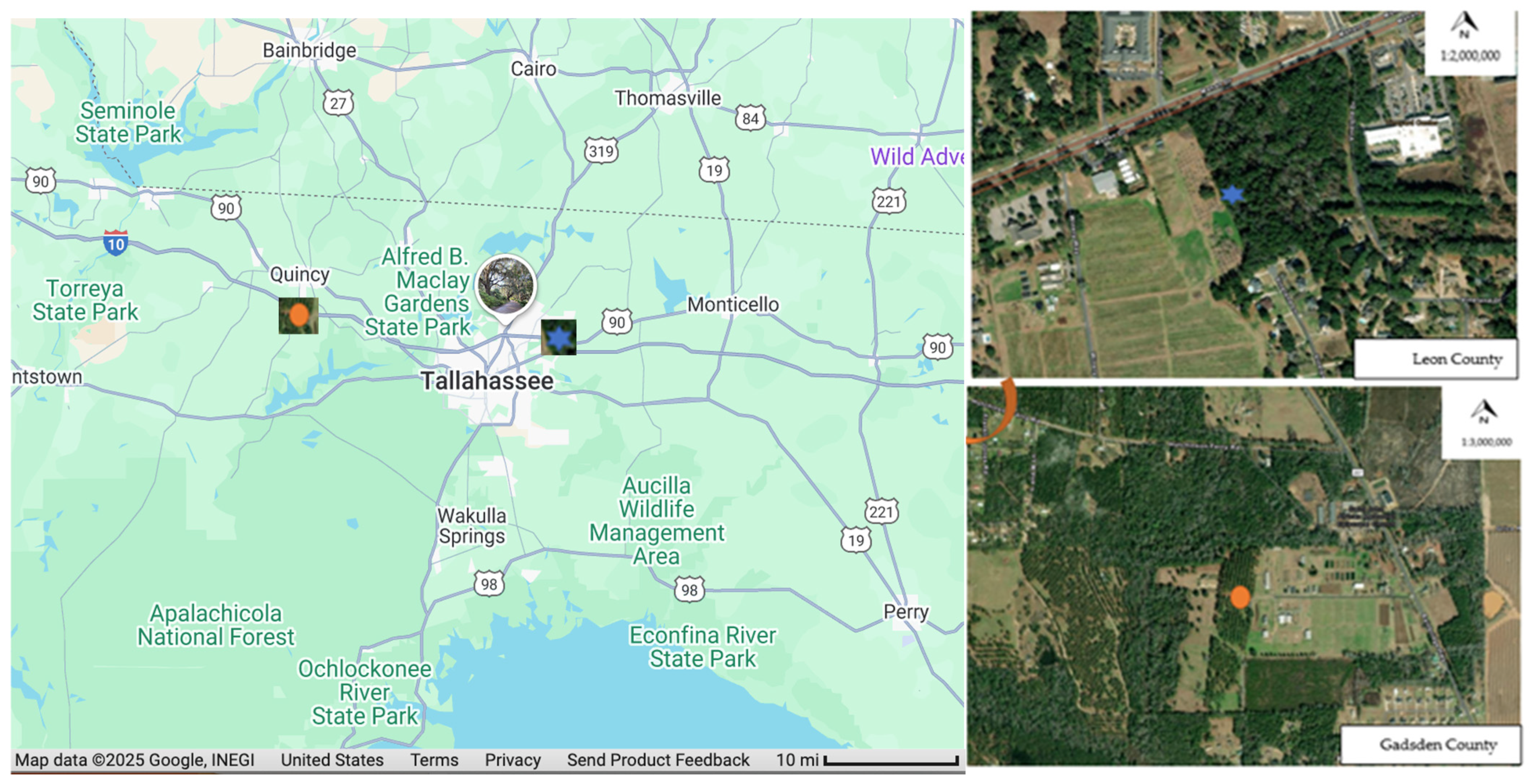 Figure 1. Map of the study sites with a blue star showing the location of Leon County site and orange oval showing the Gadsden County site. Source: Google Maps.