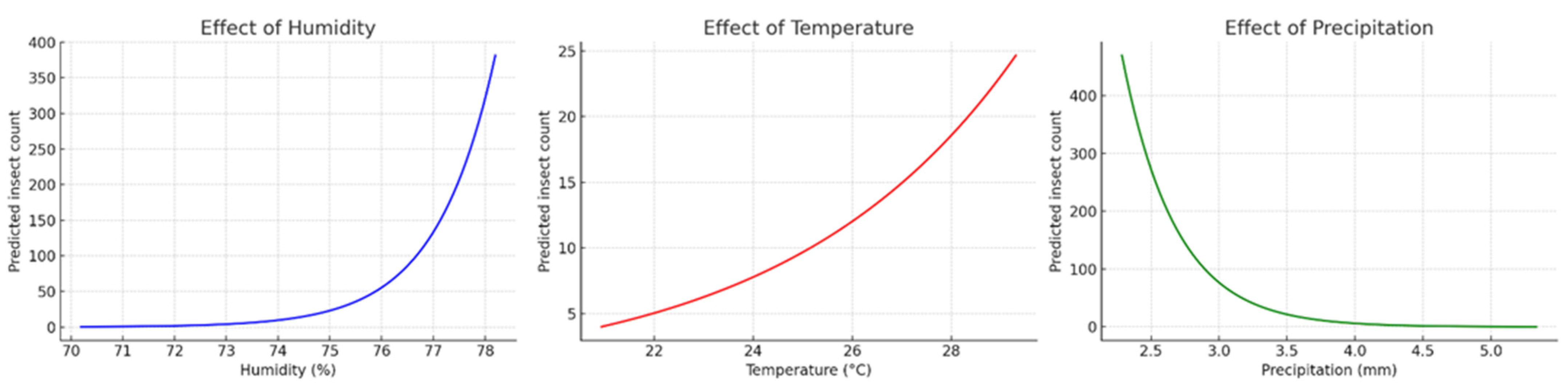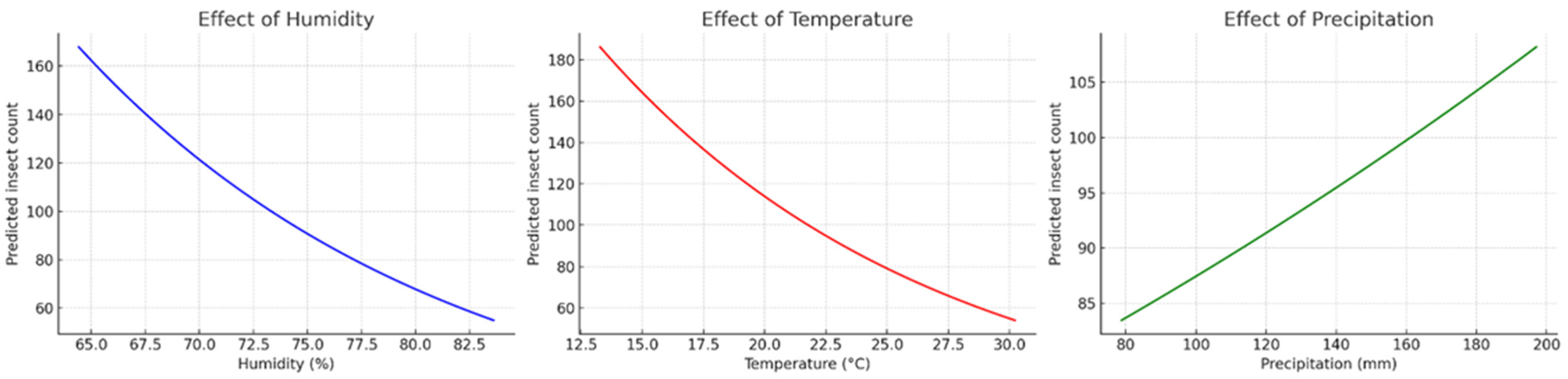 Among the climatic factors, both relative humidity and temperature had significantly negative effects on abundance. For each 1% increase in humidity, the predicted insect abundance decreased by approximately 5.6%, while a 1 °C increase in temperature resulted in an estimated 7.1% reduction in the beetle numbers. Conversely, precipitation had a significantly positive effect: each 1 mm increase in rainfall promoted an increase of about 0.22% in the beetle abundance (Figure 4).
