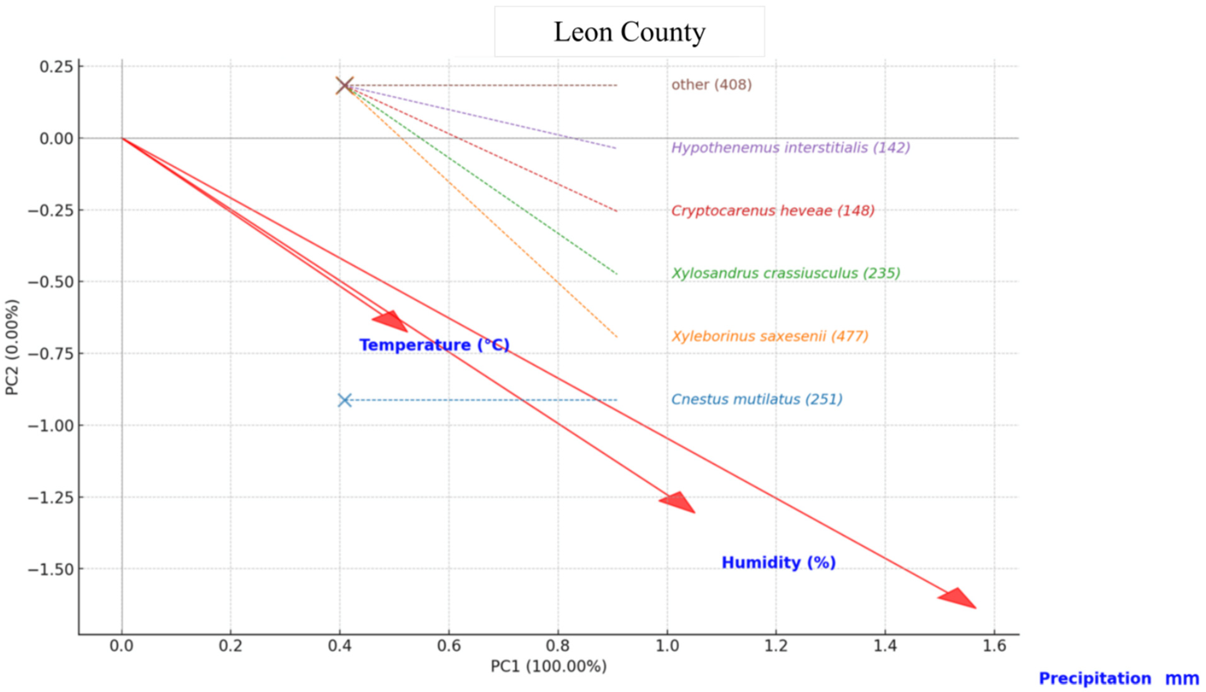 In Leon County, the PCA revealed that the moisture-related variables relative humidity and precipitation were the primary drivers of beetle assemblage structure, while temperature contributed a secondary, opposing gradient. Xyleborinus saxesenii and Xylosandrus crassiusculus were strongly associated with high humidity and rainfall, indicating a preference for wetter conditions. Cryptocarenus heveae showed a weaker but still positive association with moisture. In contrast, Cnestus mutilatus aligned most closely with the temperature vector, reflecting its tendency to be more abundant under relatively warmer and drier conditions. Hypothenemus interstitialis and the mixed-species “Other” group occupied positions near the ordination center, suggesting broad ecological tolerances or weak climatic associations. Overall, moisture emerged as the dominant factor shaping species composition, with temperature exerting a secondary influence (Figure 6).