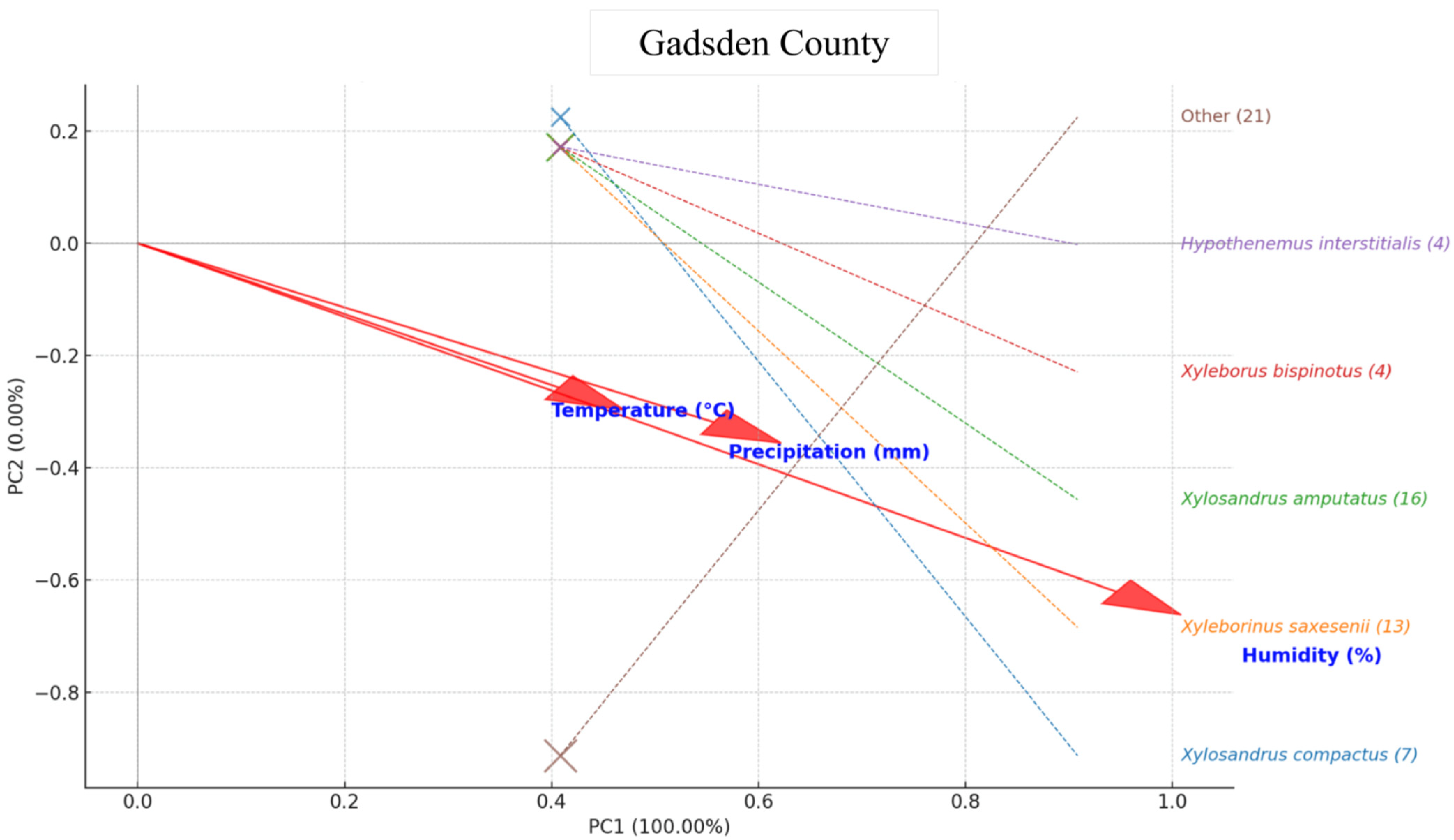 In Gadsden County, the PCA indicated that moisture, particularly relative humidity and closely followed by precipitation, was the dominant environmental factor affecting beetle assemblages. Xyleborinus saxesenii showed the strongest association with high humidity and rainfall, reflecting a clear preference for wetter conditions. Xylosandrus amputatus and Xyleborus bispinatus displayed moderate alignment with this same moisture gradient, while Xylosandrus compactus also occupied the wet-climate quadrant but with weaker influence due to its lower abundance. Hypothenemus interstitialis plotted near the ordination center, indicating broad tolerance or limited climatic sensitivity. The mixed “Other” category showed only modest association with moisture, consistent with its heterogeneous species composition. Overall, the Gadsden assemblage suggests that humid, rainy periods disproportionately favor X. saxesenii and, to a lesser extent, X. amputatus, X. bispinatus, and X. compactus, highlighting moisture as the key driver of species activity in this county (Figure 7).