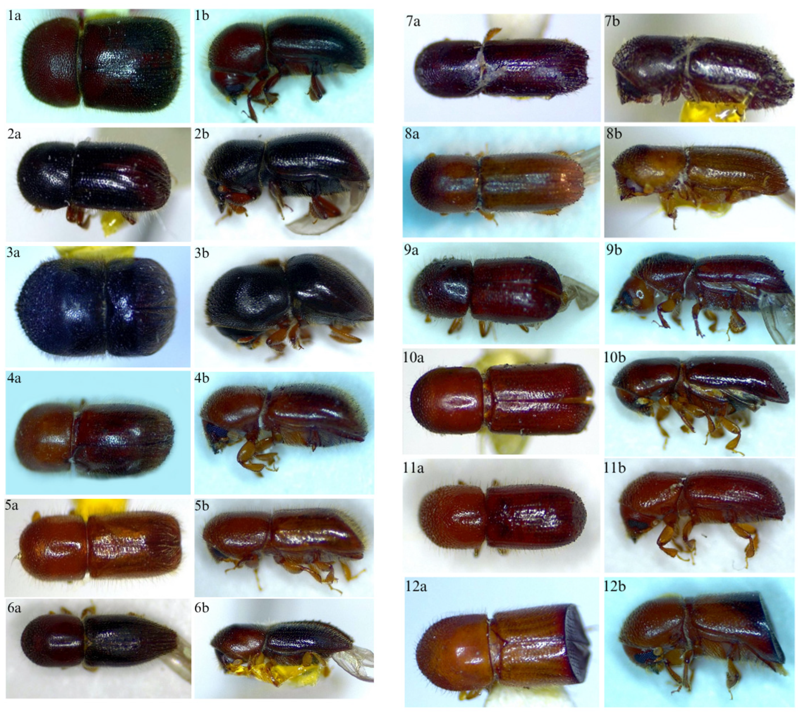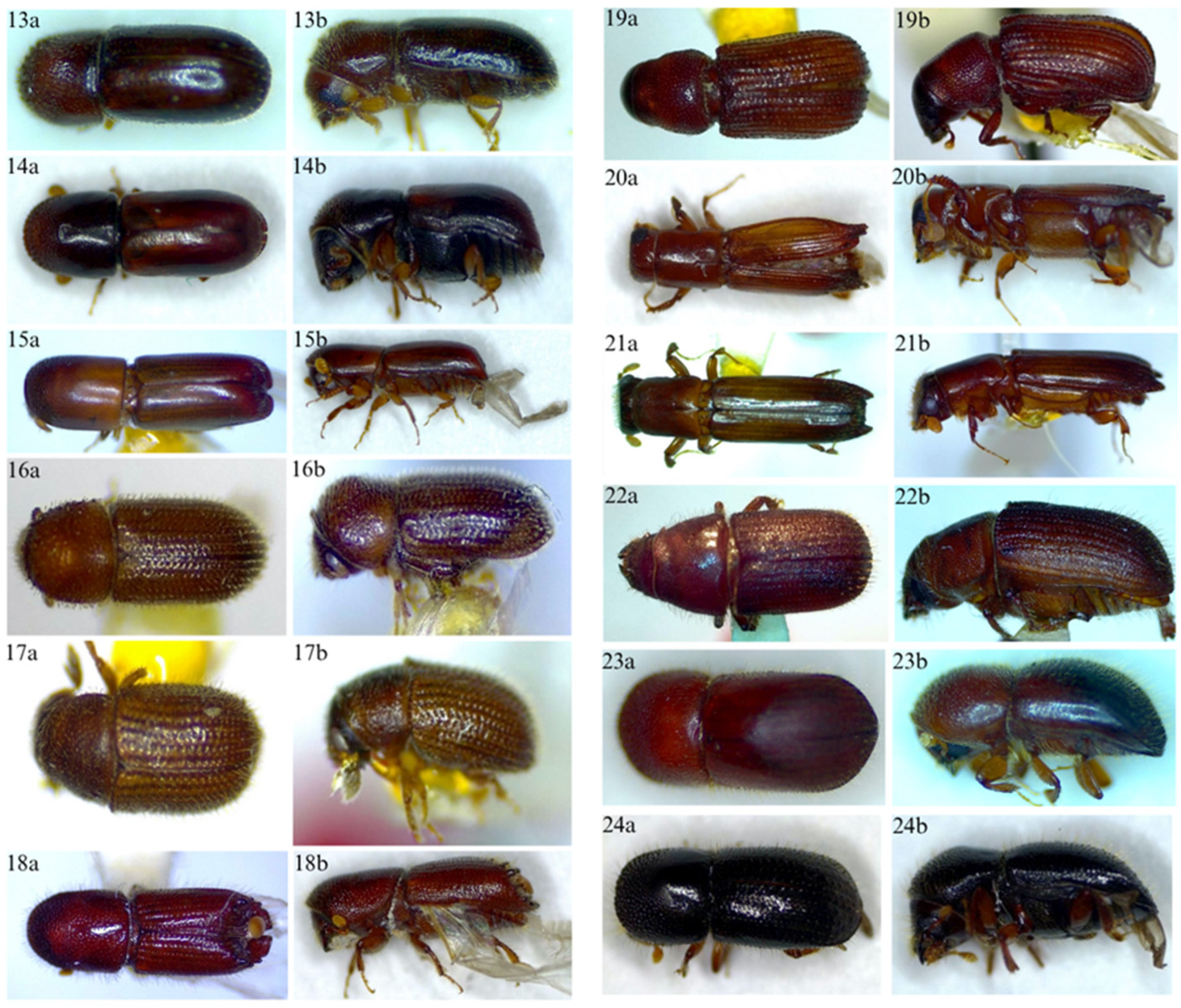 Figure 8. Dorsal and lateral habitus of collected and identified beetles (A. lewisi 1a,1b), (A. astratus 2a,2b), (C. mutilatus 3a,3b), (C. distinguendum 4a,4b), D. onoharaense 5a,5b), (X. andrewesi 6a,6b), (X. gracillis 7a,7b), (X. saxesenii 8a,8b), (X. bispinatus 9a,9b), (X. glabratus 10a,10b), (X. pubescens 11a,11b), (X. amputatus 12a,12b), (C. heaveae 13a,13b), (G. materiarius 14a,14b), (M. mali 15a,15b), (H. interstitialis 16a,16b), (D. terebrans 17a,17b), (I. grandicollis 18a,18b), (S. brevis 19a,19b), (E. compositus 20a,20b), (M. flavicornis 21a,21b), (P. liminaris 22a,22b), (X. crassiusculus 23a,23b), (X. compactus 24a,24b).