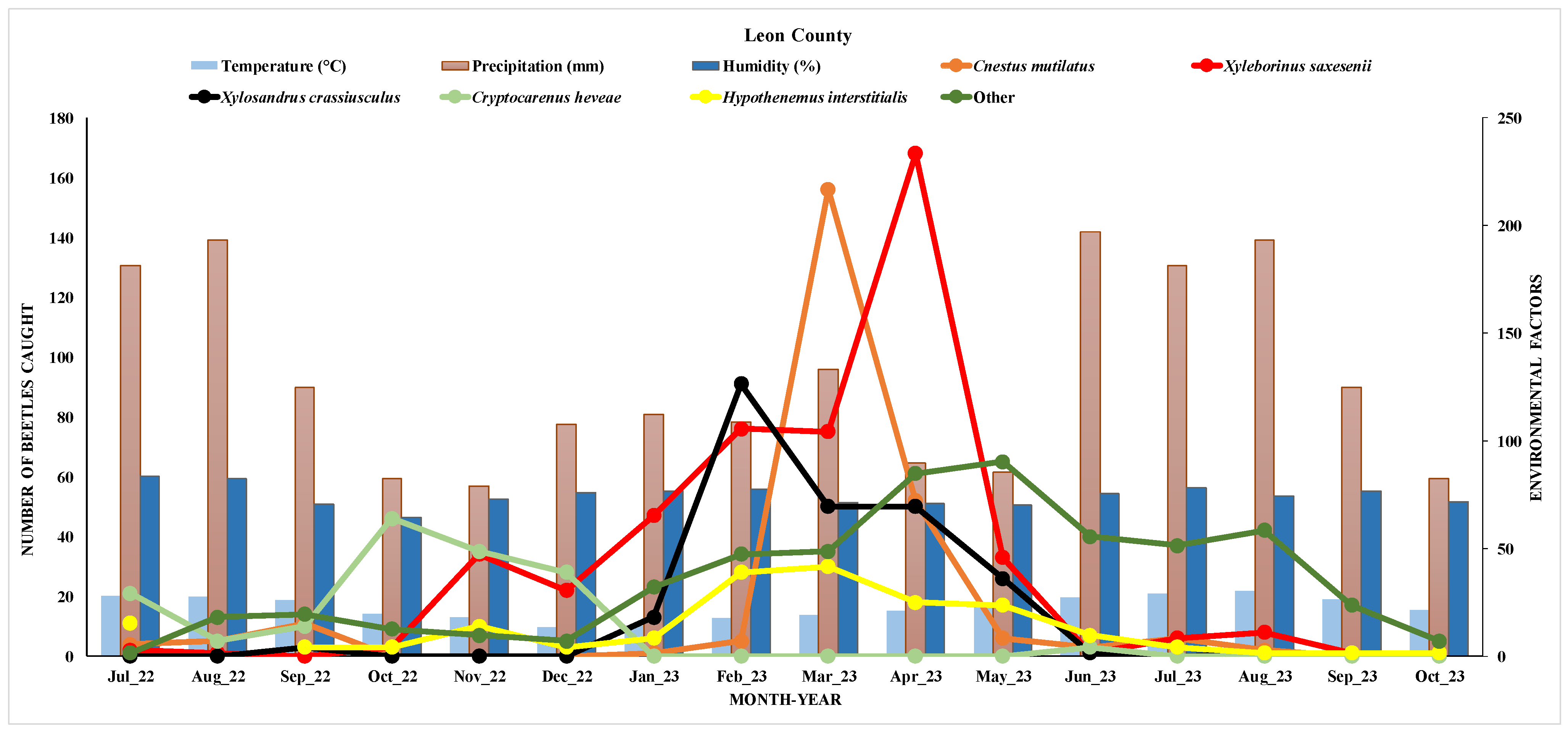 Figure 9. Seasonal distribution of the dominant species of the ambrosia and pine bark beetles and effects of environmental factors in Leon County.
